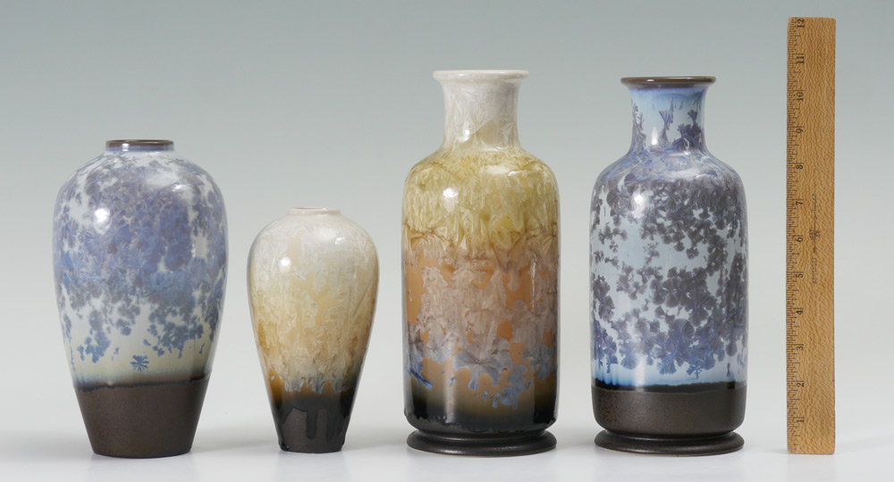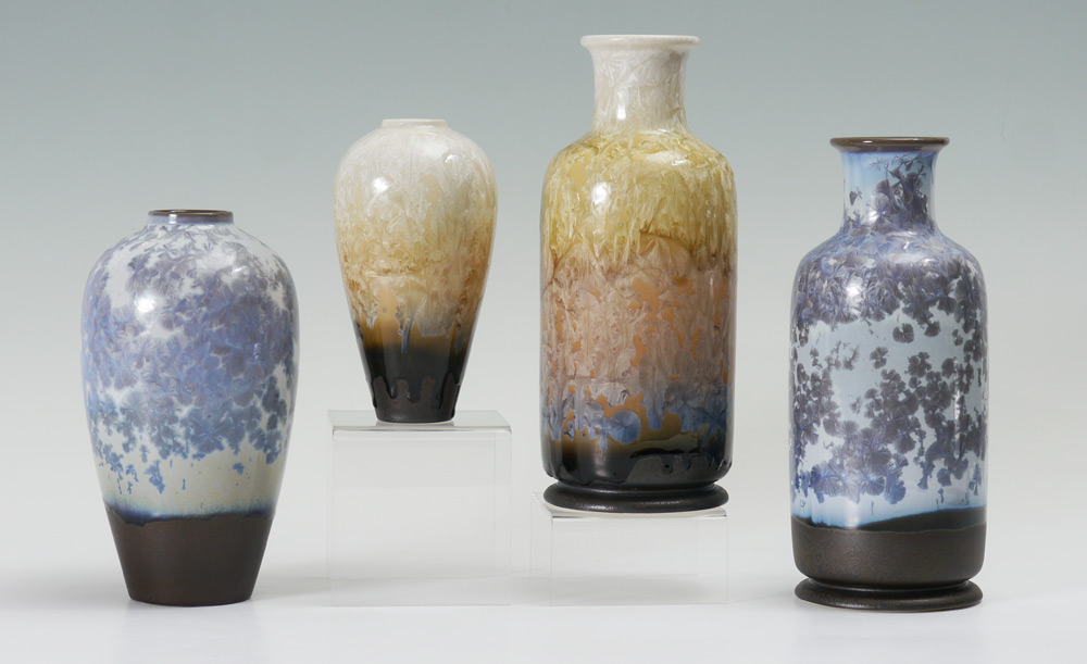 4 LLADRO PORCELAIN VASES: 1) SILVER VASE No.5 #5508.4, Julio Ruiz sculptor, issued 1988 retired 1991, blue Lladro stamp, impressed 5508, 10.5''; 2) TOPAZ VASE No.5 #5508.5, Julio Ruiz sculptor, issued 1988 retired 1991, blue Lladro stamp, impressed 5508, 10.5''; 3) TOPAZ VASE, Julio Fernandez sculptor, blue Lladro stamp, impressed 5511, 7''; 4) SILVER VASE No.14 #5511.4, Julio Fernandez sculptor, blue Lladro stamp, 9''. Sold as a lot.