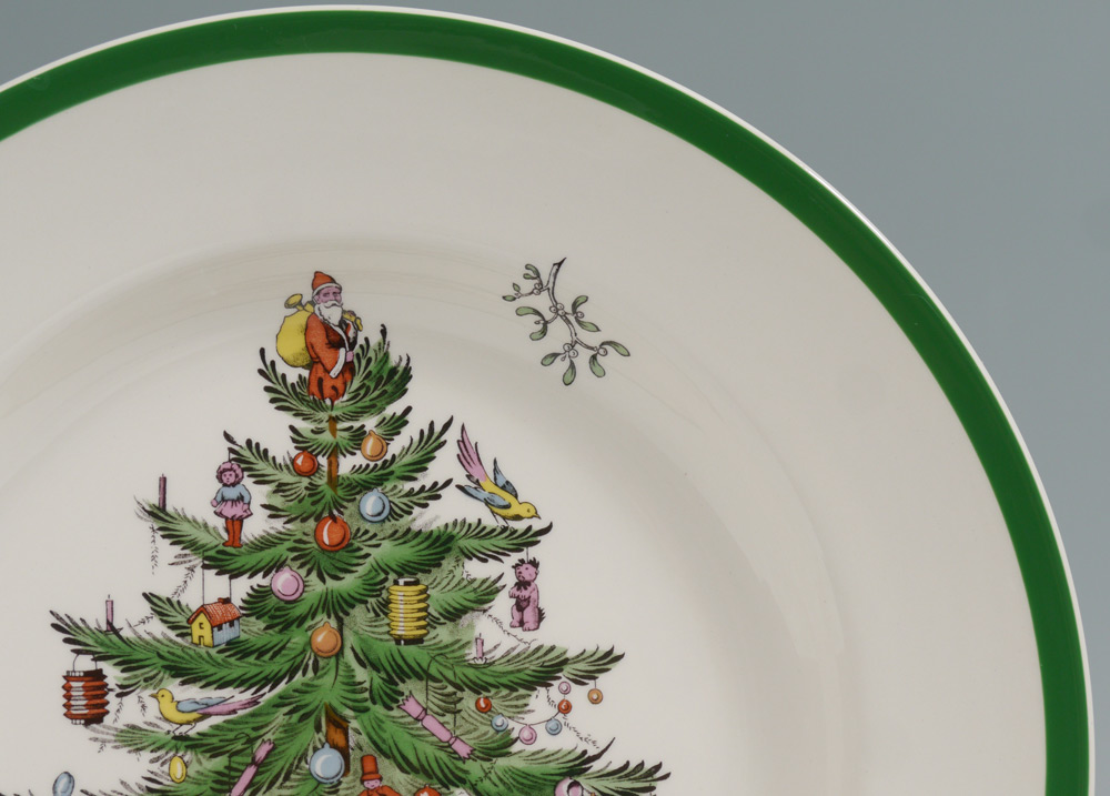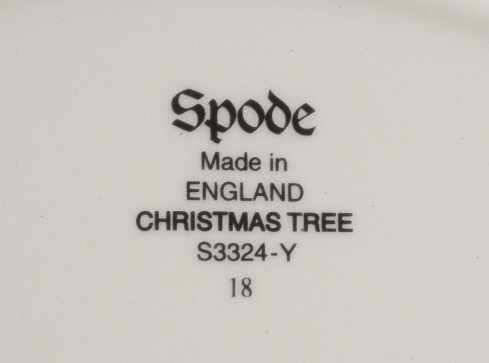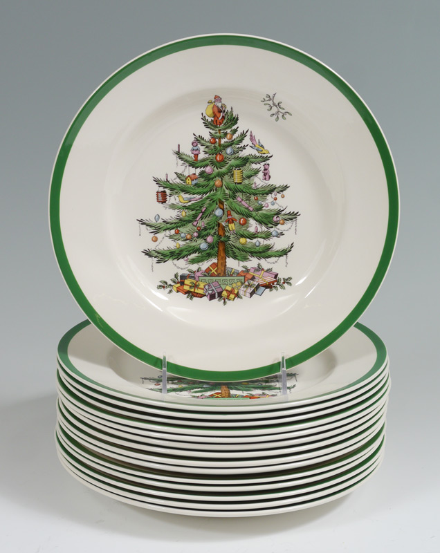 14 SPODE ''CHRISTMAS TREE'' DINNER PLATES: A classic at Christmas time. 10 5/8'' dia.