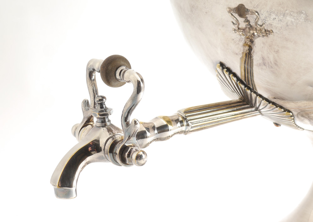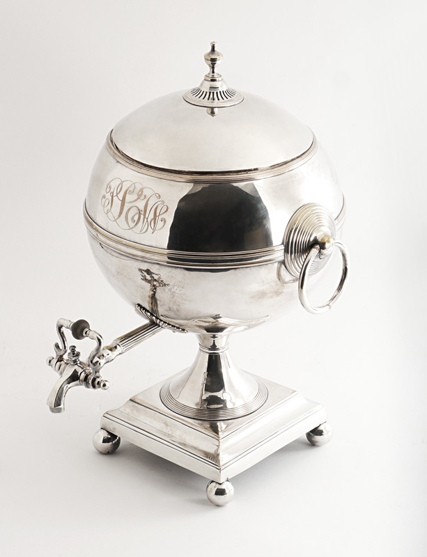 LARGE SILVERPLATE COFFEE URN: Unmarked, monogrammed round body with handles, removable lid, center heat column. On base with 4 ball feet, 16 3/4'' h. x 13''.