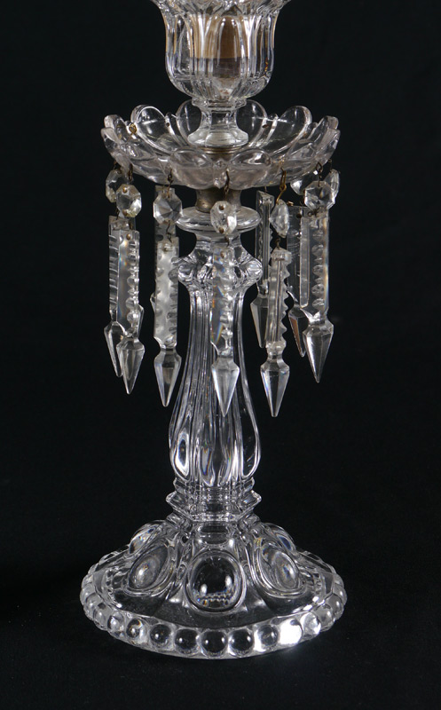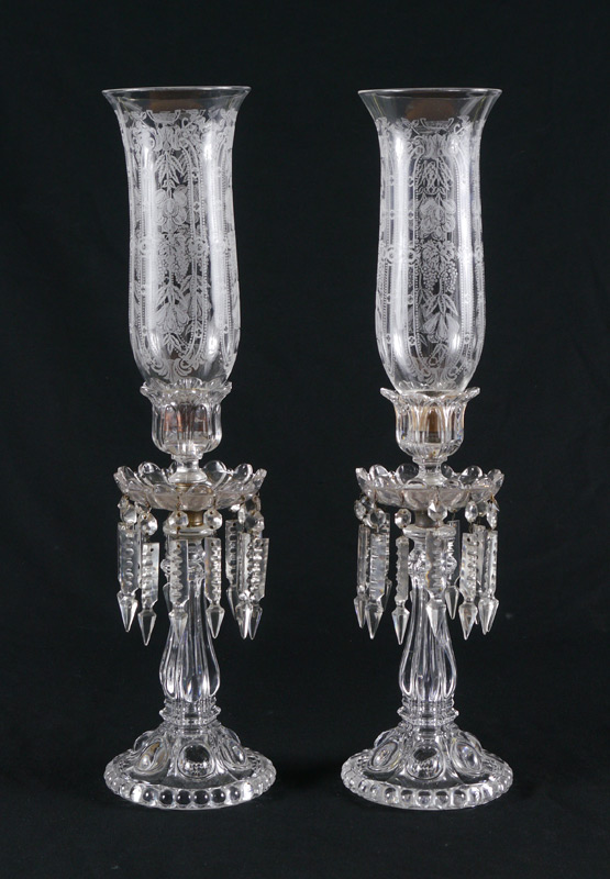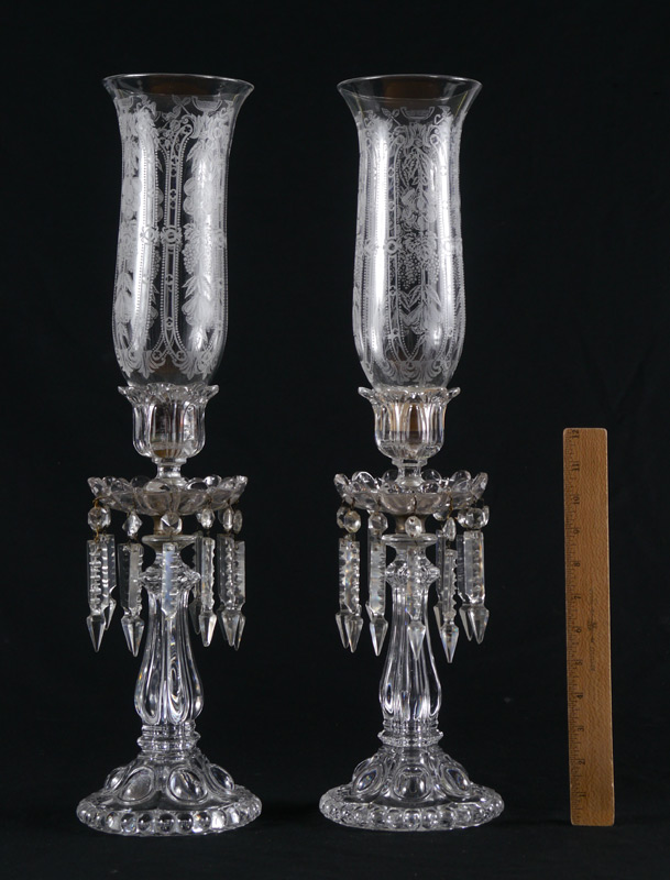 PAIR PRESSED GLASS CANDLE STANDS: Each stand has pressed glass base with prism drops and flared shades with etched fruit and foliate motifs. Overall 22 3/4'' h. x 6'' dia.