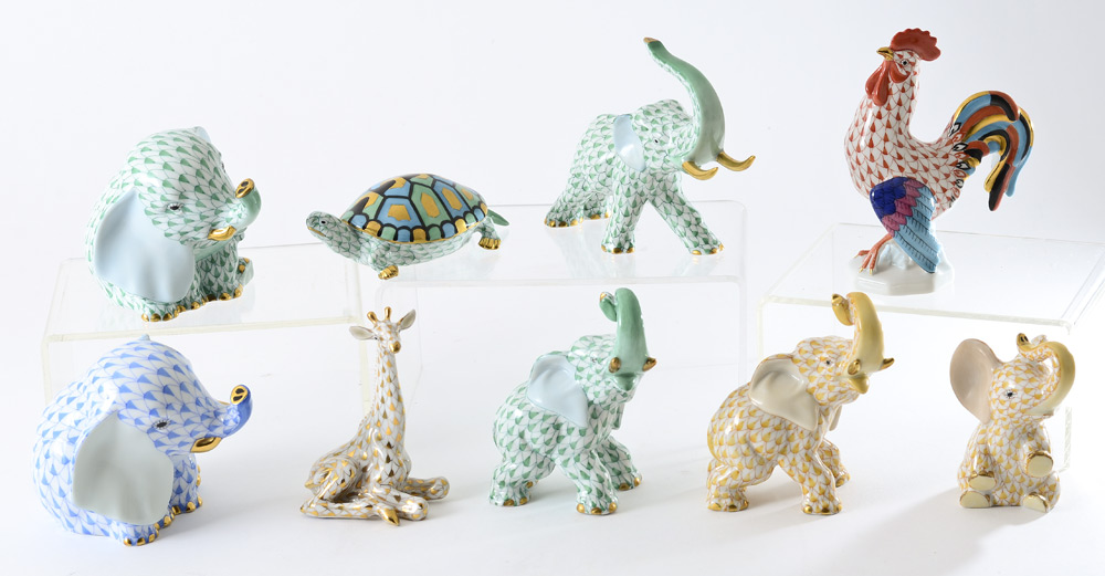 9 PIECE HEREND PORCELAIN ANIMAL FIGURES: 9 pieces total to include 6 elephants in various poses, seated giraffe, rooster and turtle. Rooster measures 4 1/2'' h. x 3 1/4''.