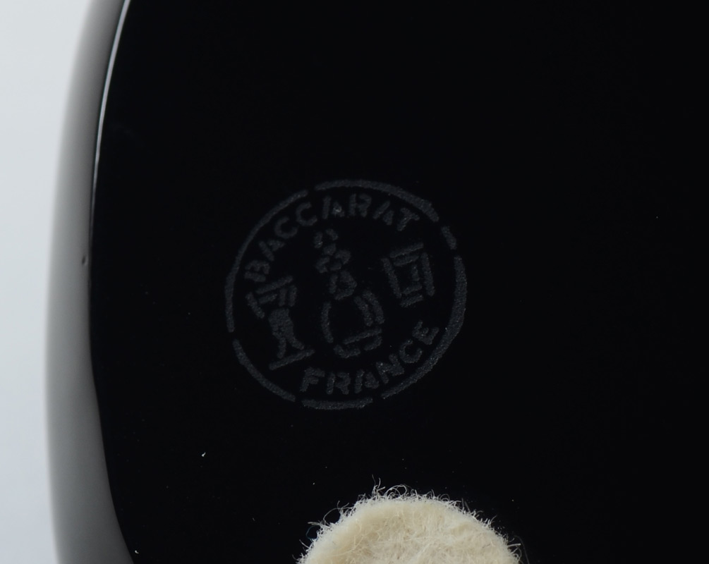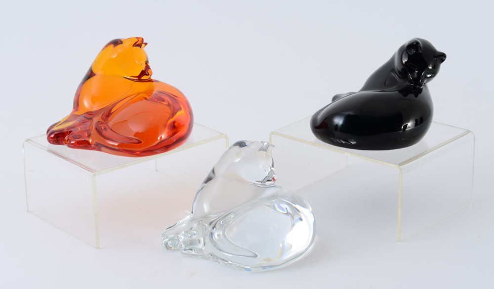 3 BACCARAT CRYSTAL CATS: Figures of 3 cats in repose, ruby, amber and clear. Each signed Baccarat, 3'' h. x 4 1/4''.