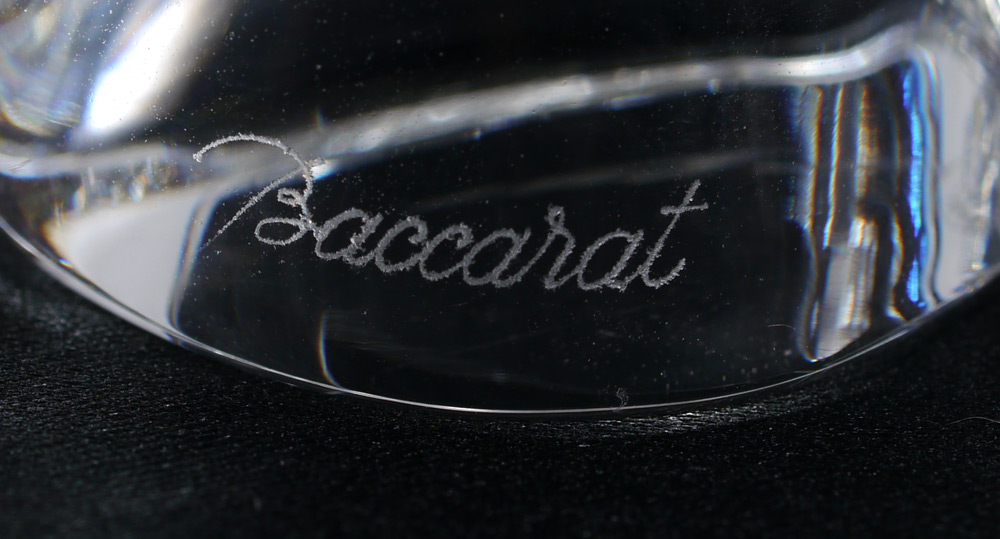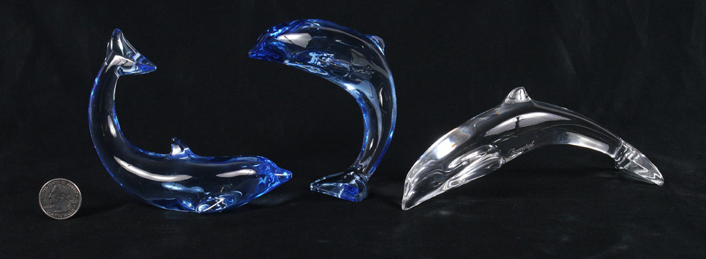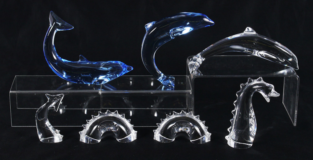 4 PIECE BACCARAT DOLPHIN & SERPENT: 4 figures total, all marked Baccarat, to include 1-3) Figural dolphin, 2 blue, 1 clear in various leaping positions. Longest 6 1/4''. 4) 4 piece clear serpent, tallest 4''.