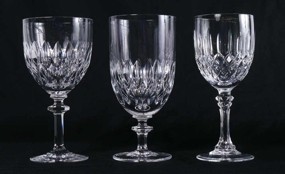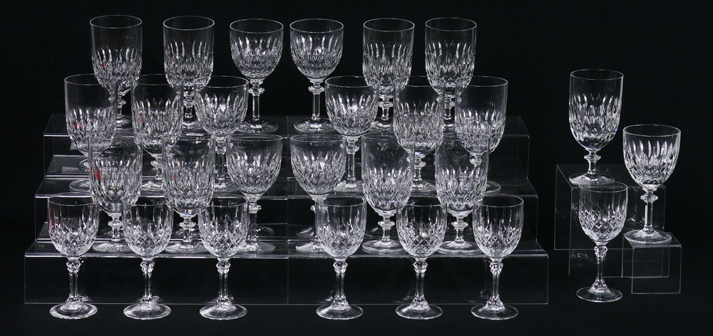 GORHAM ALTHEA CRYSTAL STEMWARE: Approx. 19 pieces in the Althea pattern by Gorham to include 6 water (7'' h.) and 11 iced tea (7'' h.). Sold with 8 additional water glasses of a different pattern from another maker (7'' h.)