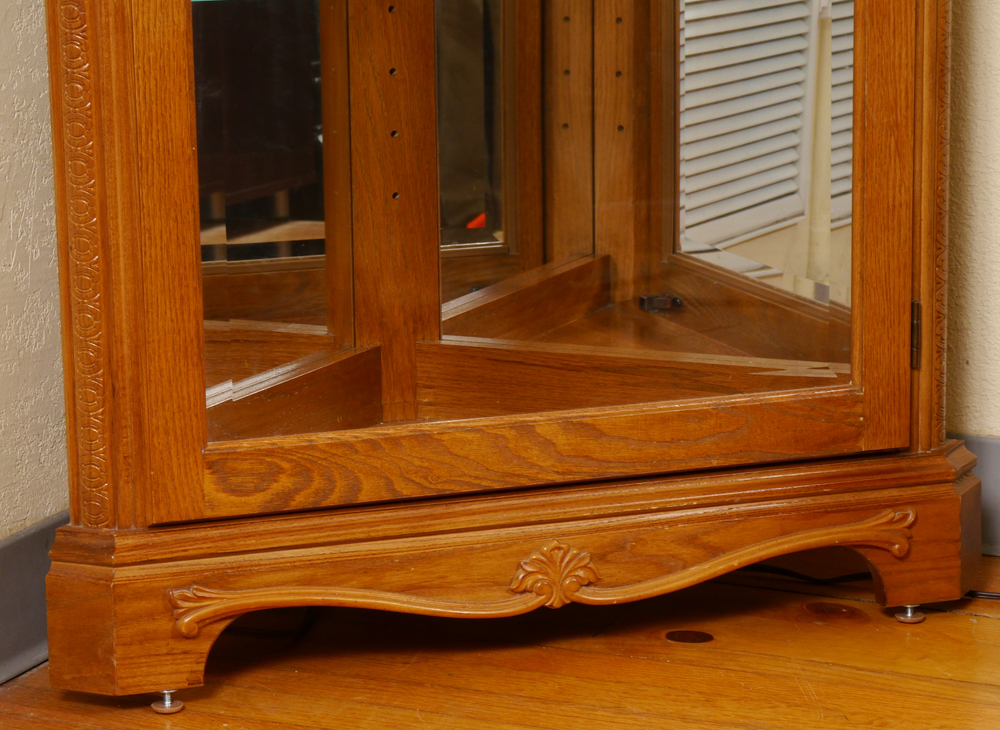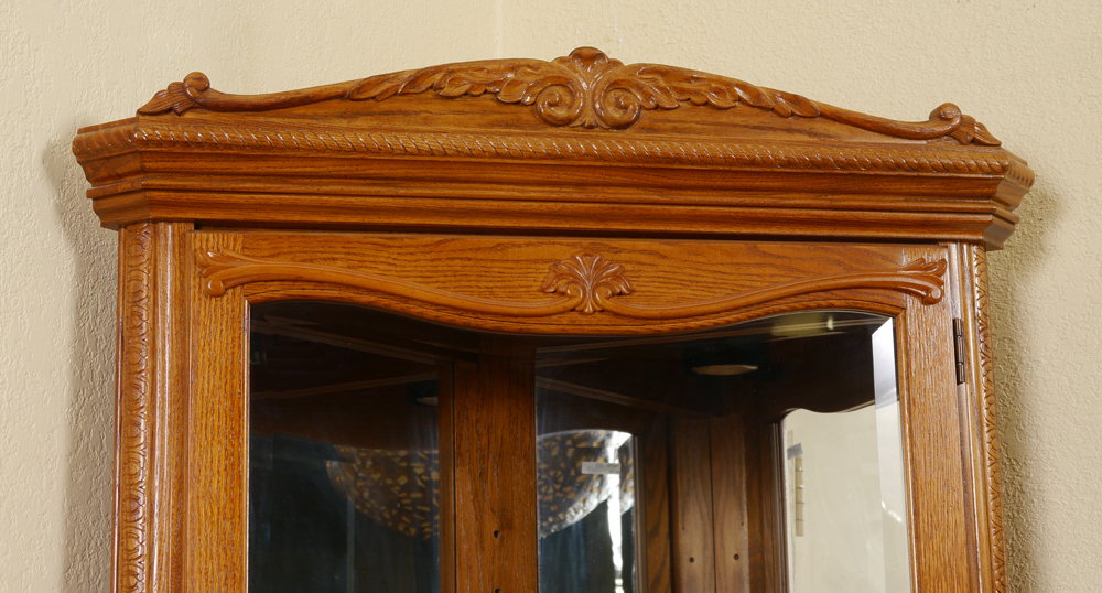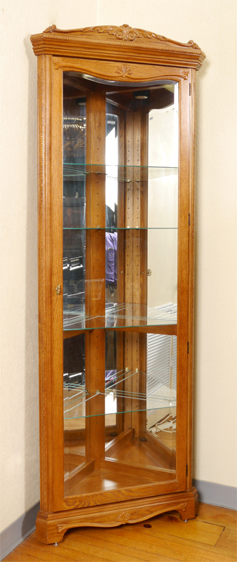 PULASKI OAK CORNER CURIO CABINET: Carved crest with foliate motif, beveled glass front door with applied decoration. Illuminated interior with 4 glass shelves and mirror back. 81'' h. x 30 1/4'' x 17''.
