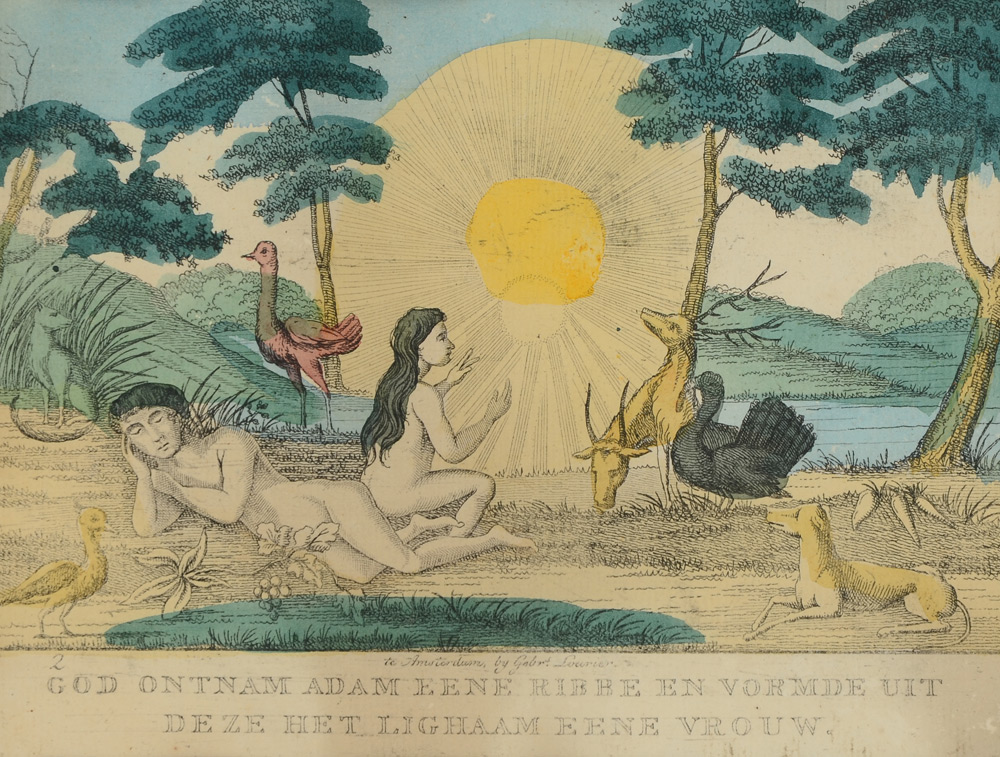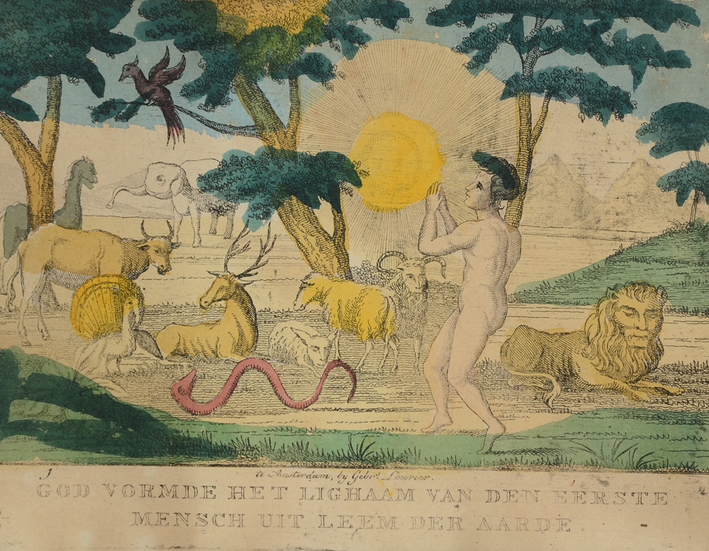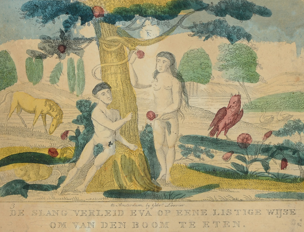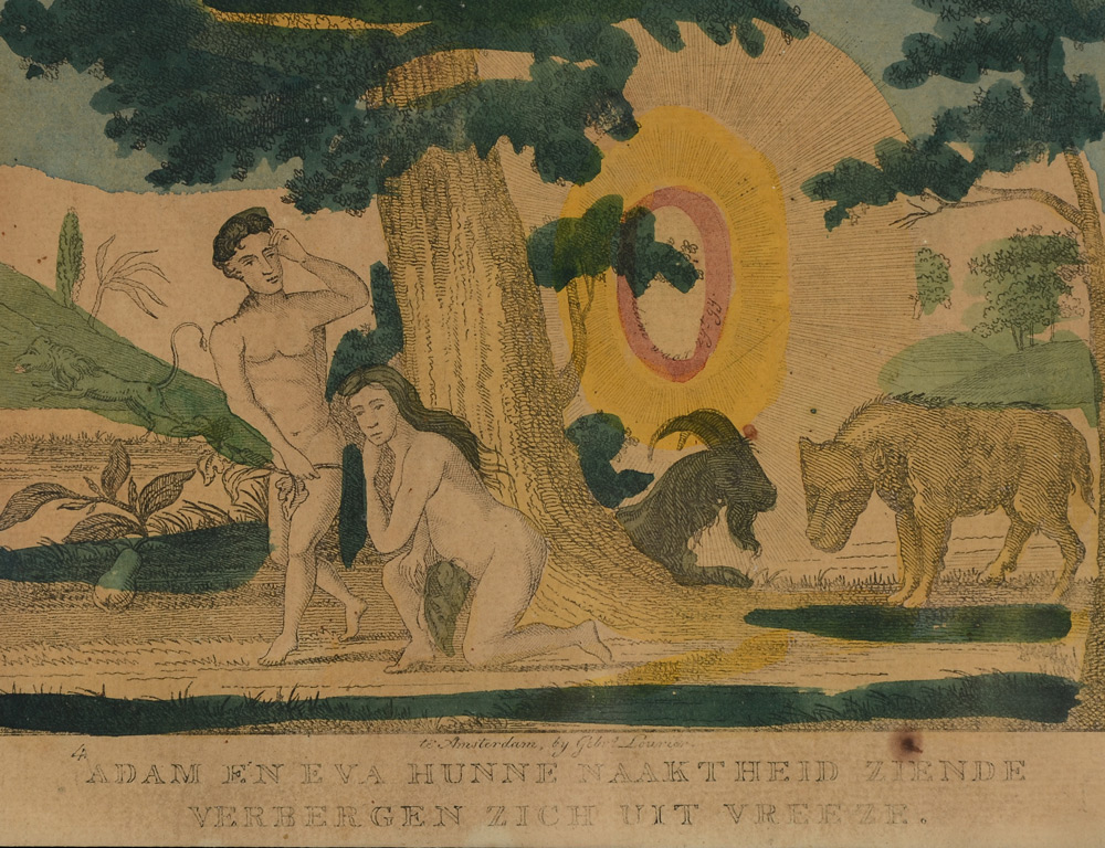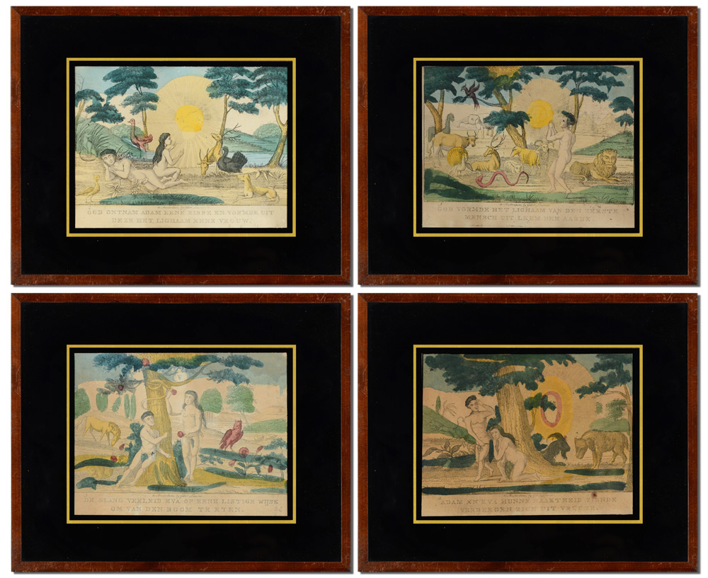 4 LOURIER ADAM & EVE COLORED AQUATINTS: 19th century, series of 4 engravings with Dutch writing depicting Adam & Eve and the Garden of Eden, marked ''te Ameterdam, Gebr. Lourier''. Sight size 5 3/4'' x 7 5/8'', framed 10 1/4'' x 12 1/4''.