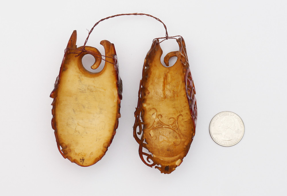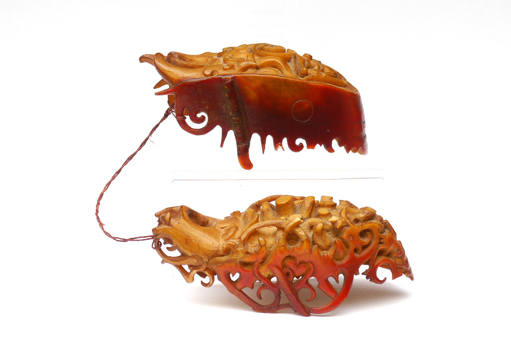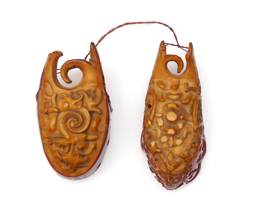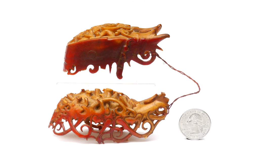 DAYAK CARVED HORNBILL BIRD EAR WEIGHTS: From the Dayak tribe of Borneo, used to slowly stretched pieced holes in the lobes to a large diameter. 2 separate weights, one more profusely carved than the other. Measures 1 1/2'' x 3 1/2'' x 1 7/8''.
