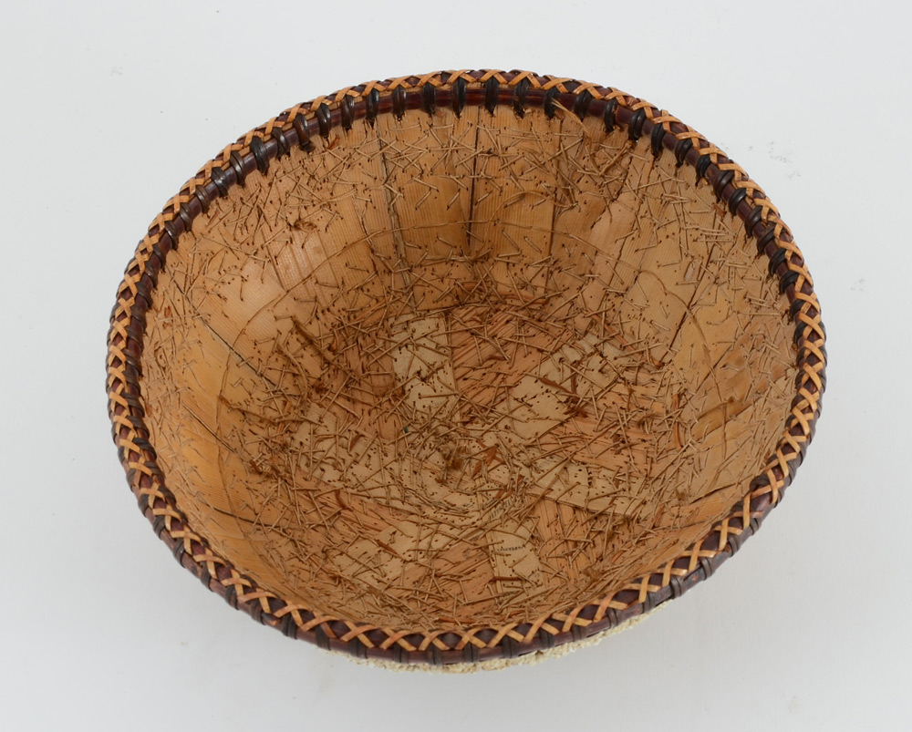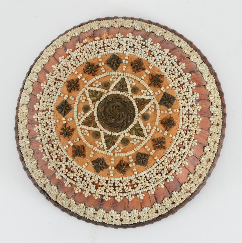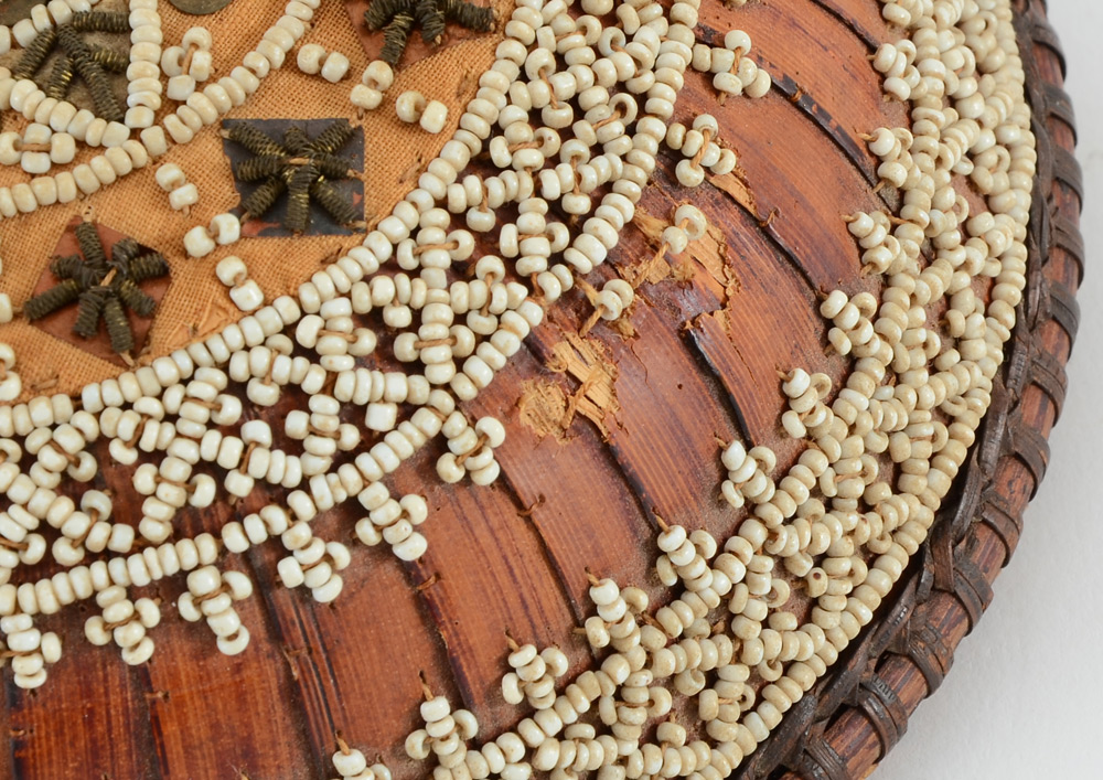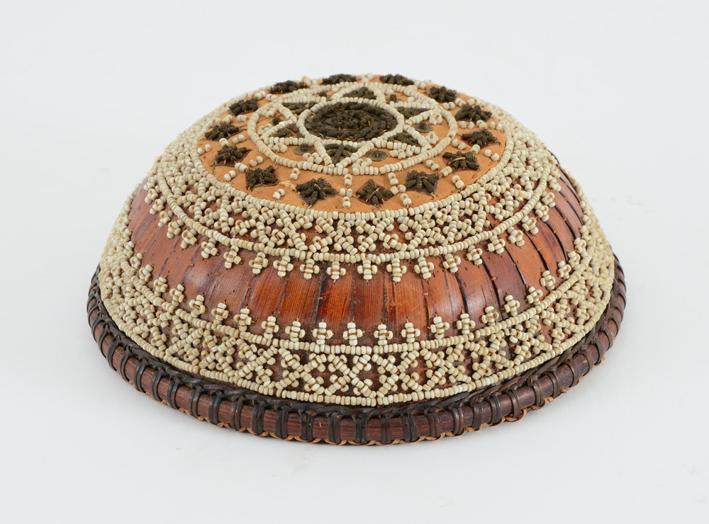 DAYAK BEADED & WOVEN BAMBOO HAT: Woven bamboo with applied beaded decoration in geometric patterns. Measures 2 1/2'' h. x 6'' dia.