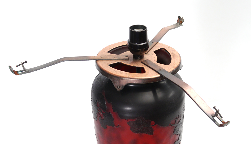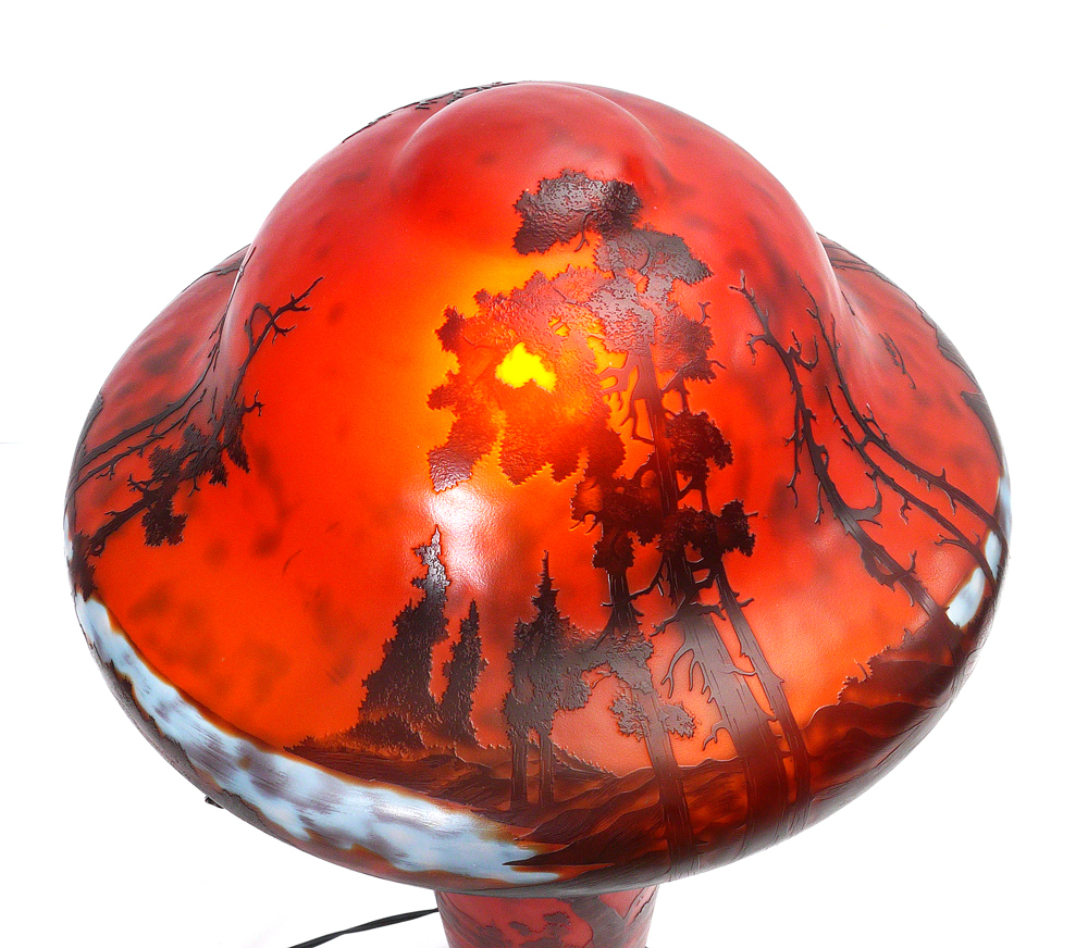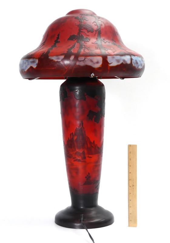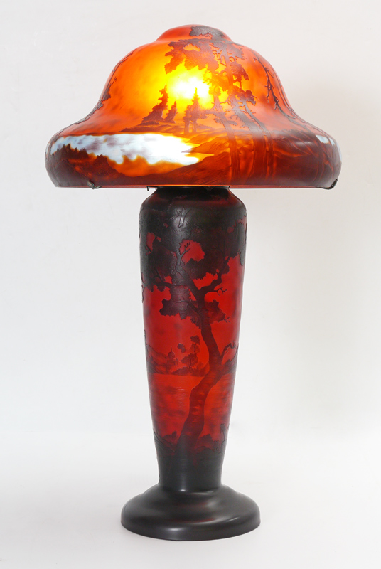 CONTEMPORARY GALLE STYLE CAMEO CUT LAMP: In the manner of Galle with spurious signature on shade, cameo amber glass base with mountainous lake genre scene. Single socket fixture, base measures 25 1/2'' x 16 1/2''. Matching cameo glass shade with blue water highlights, 10'' h. x 18 1/2''. For a pair see previous lot 1392.