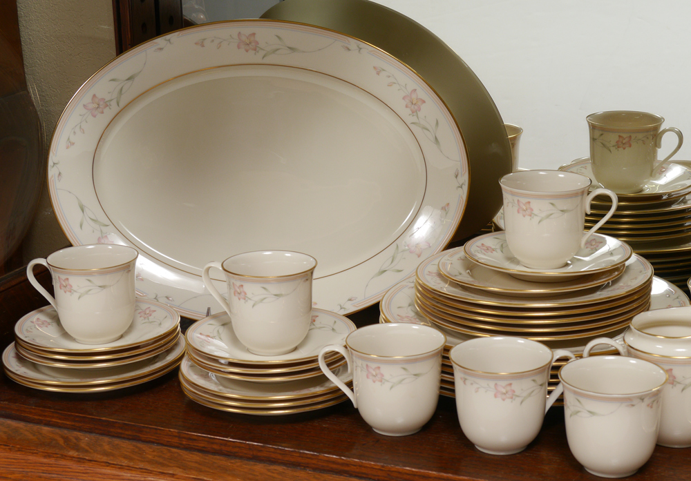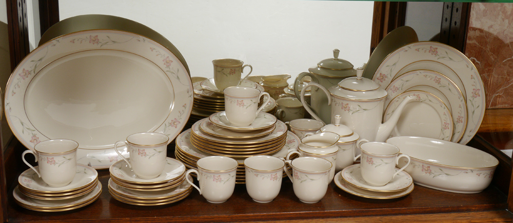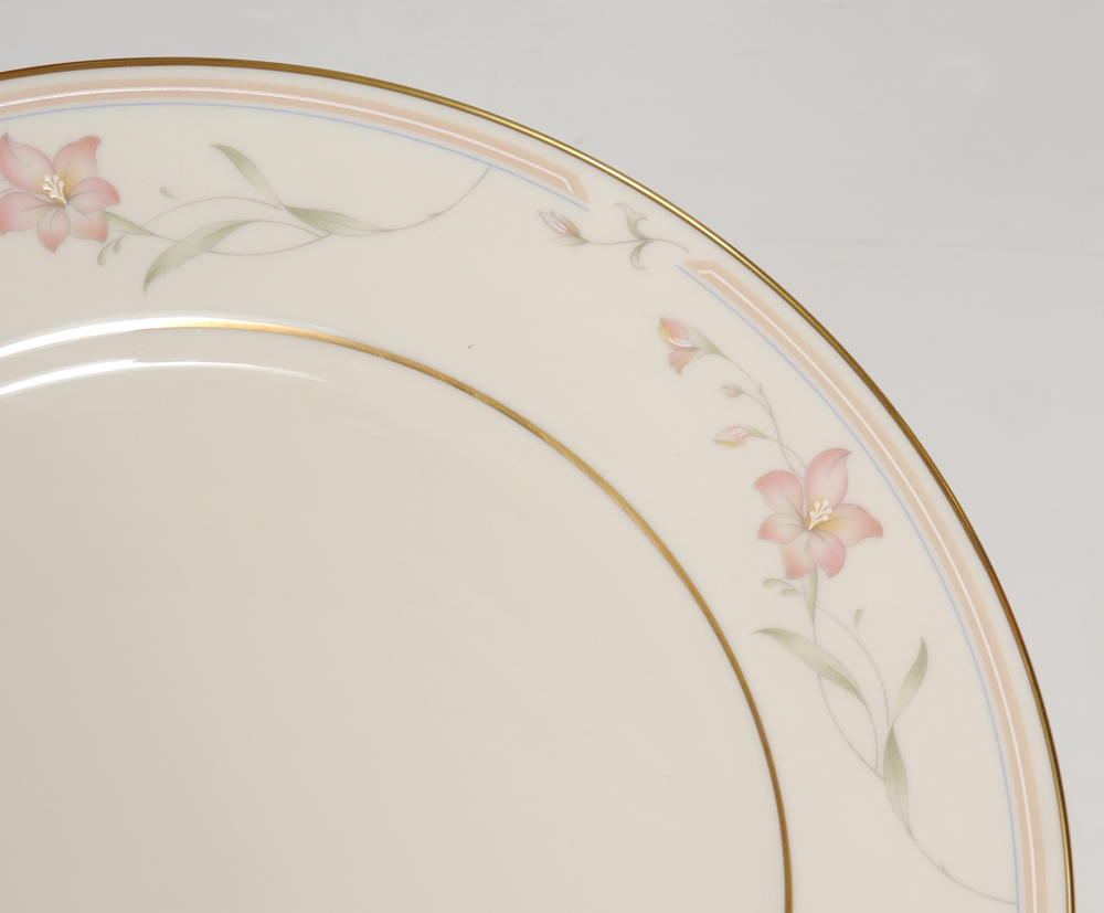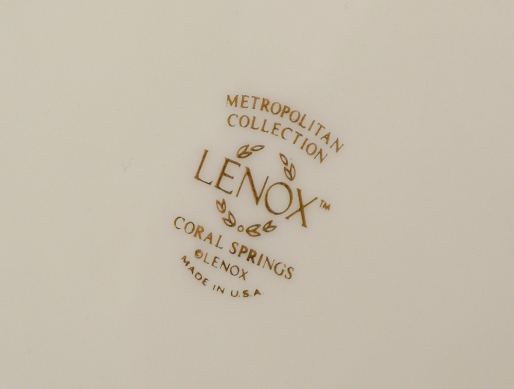 LENOX CORAL SPRINGS CHINA SERVICE: Approx. 43 pieces in the Coral Springs pattern from Lenox to include 8 dinner plates (11''), 6 salad plates (8 1/4''), 8 bread plates (6 1/2''), 8 teacups and saucers, oval platter (11 3/4'' x 16''), open vegetable, open creamer, covered sugar, coffee pot.