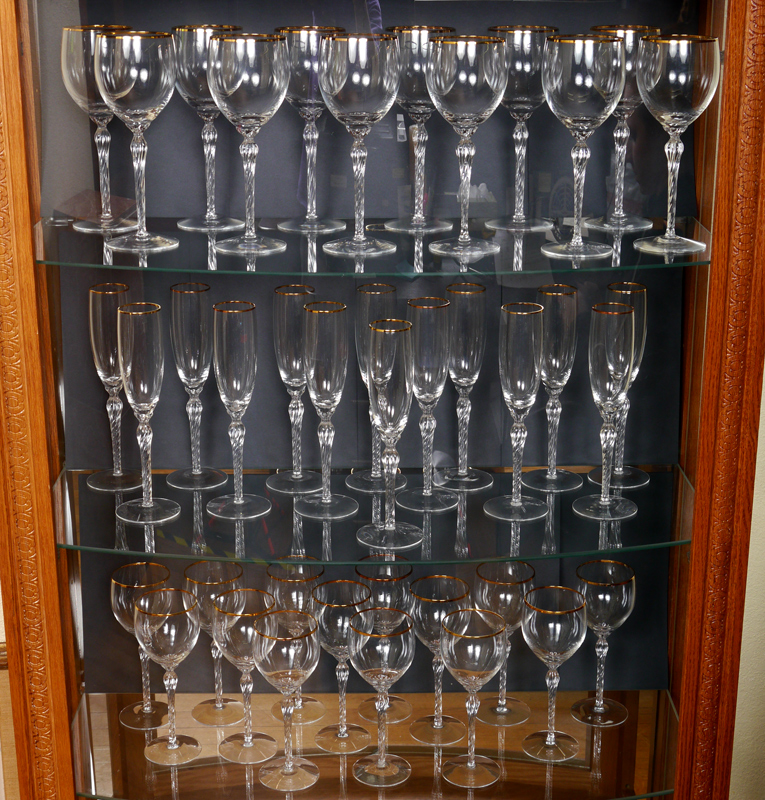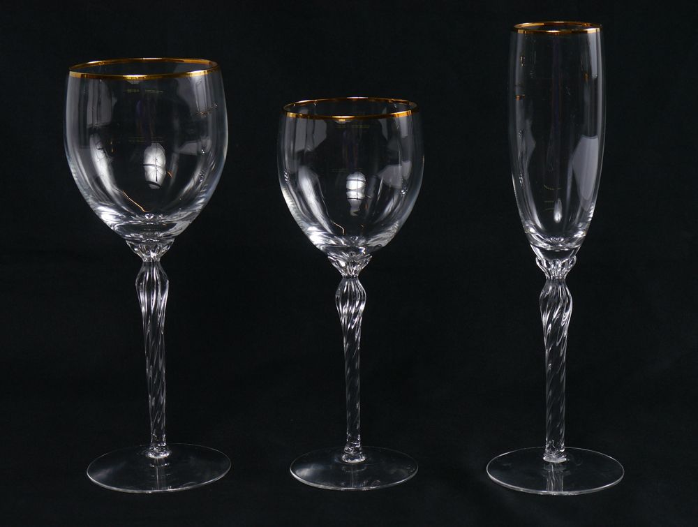 LENOX MONROE CRYSTAL STEMWARE: 40 pieces in the gold trimmed Monroe pattern by Lenox to include 12 water goblets (8 1/2'' h.), 14 champagne flutes (9 1/4''), 14 wine (7 1/2'').
