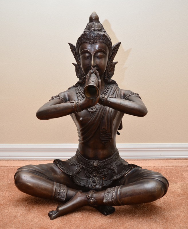 SEATED BRONZE THAI MUSICIAN: Figure of a musician in seated lotus position, playing a instrument. Measures 24'' h. x 18 1/2'' x 13 1/2'', actual age unknown.