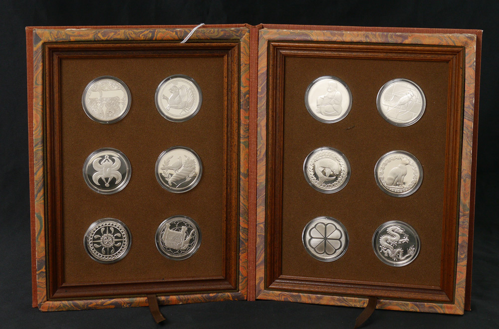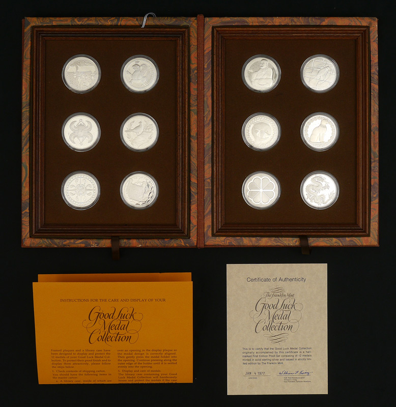 FRANKLIN MINT STERLING GOOD LUCK MEDAL COLLECTION: 12 medals with various symbols of good luck from around the globe. Each medal approx. .7 troy oz., approx. 8.4 troy oz. Sold with collectors case & COA's, 2'' x 10 1/2'' x 8 1/4''.