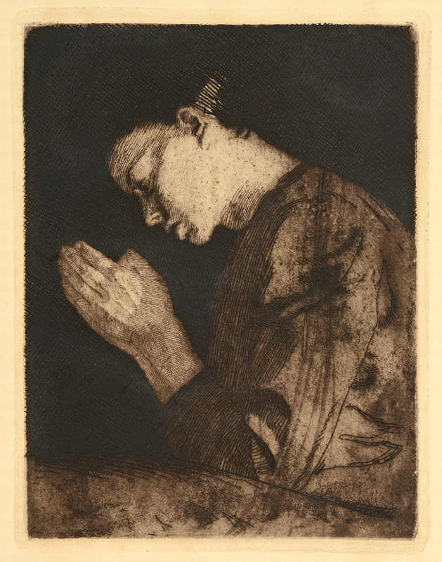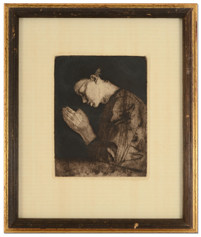 KOLLWITZ, Kathe, (German, 1867-1945): ''Batendes Madchen'', Etching, Sight size 12'' x 9 3/4'', Blind Stamp in the lower right corner ''Muchen 22'', framed 14 1/4'' x 12''.