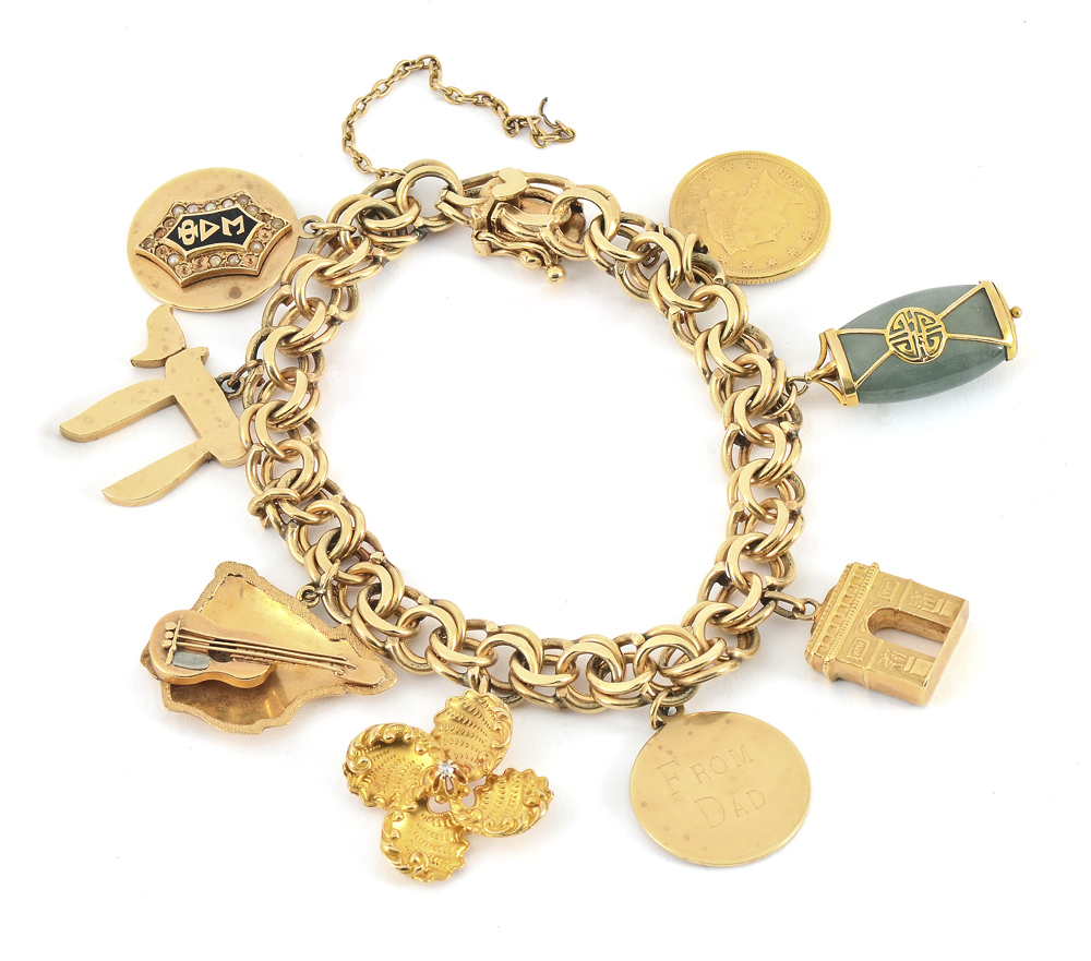 14K GOLD CHARM BRACELET: Vintage double loop charm bracelet with 8 charms including an 1866 Liberty head $2.5 coin (drilled), and jade amulet. Length 7.5''. Weight 51.3 grams.