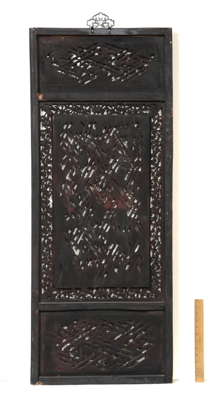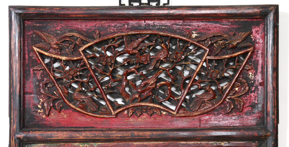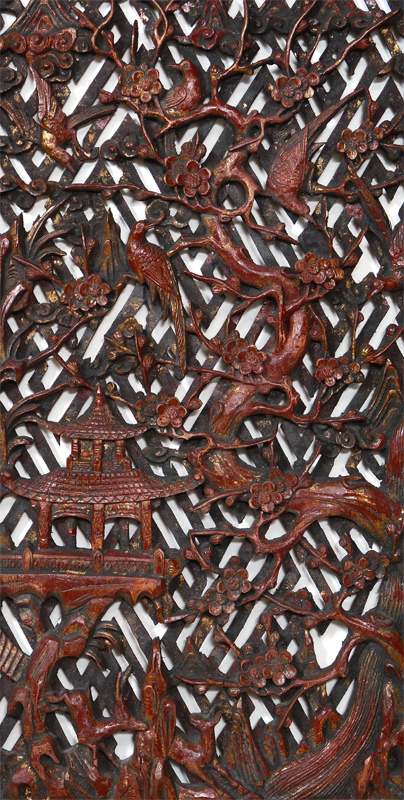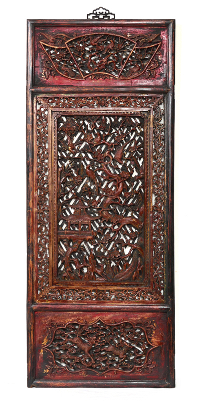 CARVED ORIENTAL WALL PANEL: Profuse pierce carved decoration with foliate, birds, pagoda and dragon motifs. Traces of red paint remain, this was most likely previously a door to a cabinet. Measures 51'' h. x 20 1/2'' x 1 1/2''