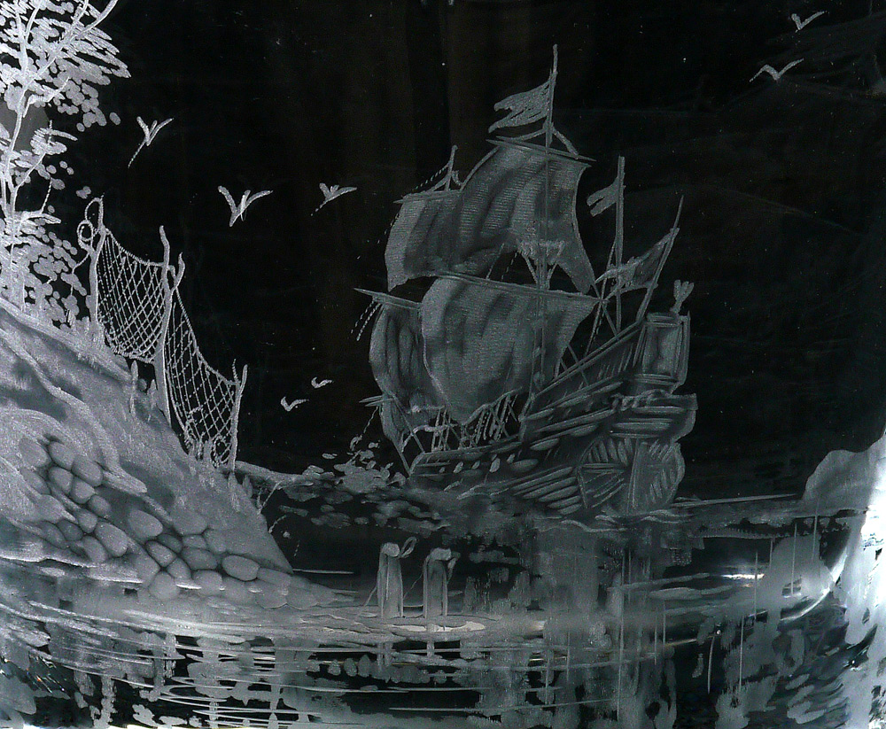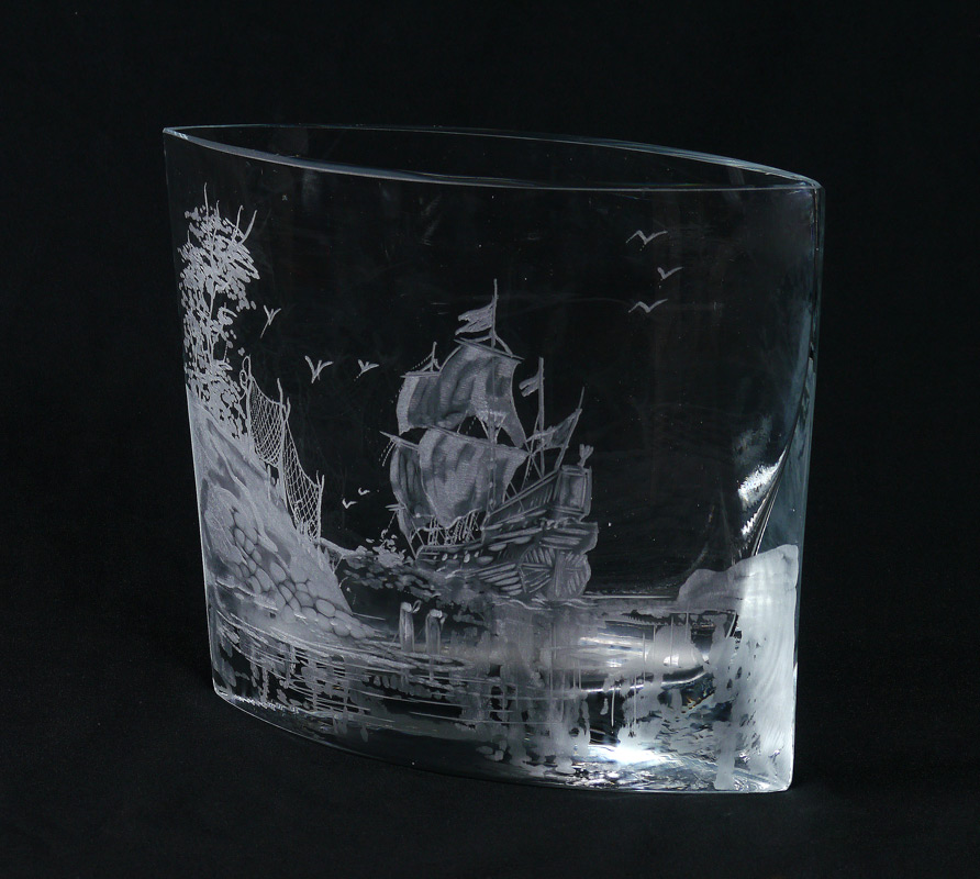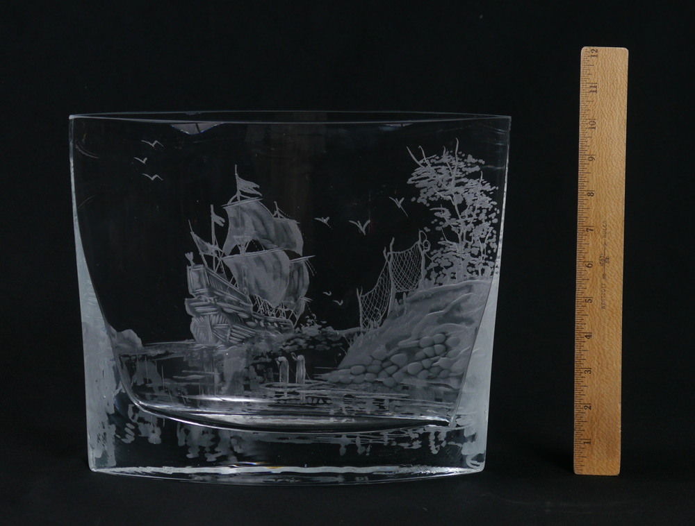LARGE CLIPPER SHIP ETCHED GLASS VASE: Large vase with etched scene of clipper ship at port, no visible markings, possibly Swedish. Overall measures 10'' h. x 12 1/4'' x 4 1/2''.