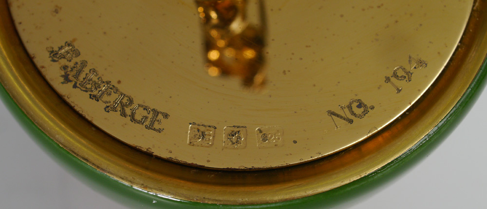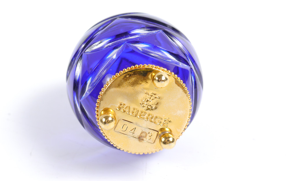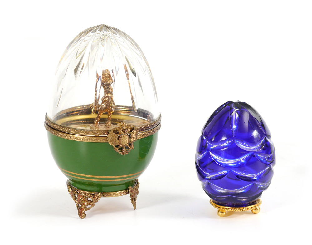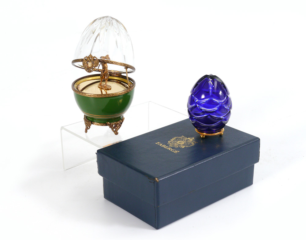SMALL COBALT FABERGE CRYSTAL EGG IN BOX AND TROPHY: 2 pieces total to include 1) Stamped on gilt metal base Faberge, 0413, 3 ball feet. 2 5/8'' h. x 1 7/8''. Sold with original presentation box, 2 1/4'' h. x 5 1/2'' x 3 3/4''. 2) Figure of a golfer inside egg with cut crystal top, green porcelain base and gilt metal mounts. Marked inside gilt metal stand ''Faberge, No. 194''.
