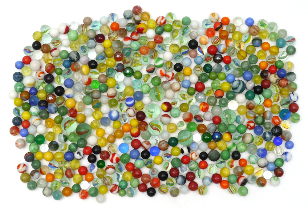 LARGE COLLECTION OF MARBLES: Approx. 497 marbles of varying sizes to include cat's eyes, clouds, ribbons, clearies, and more. Largest 7/8'' dia.