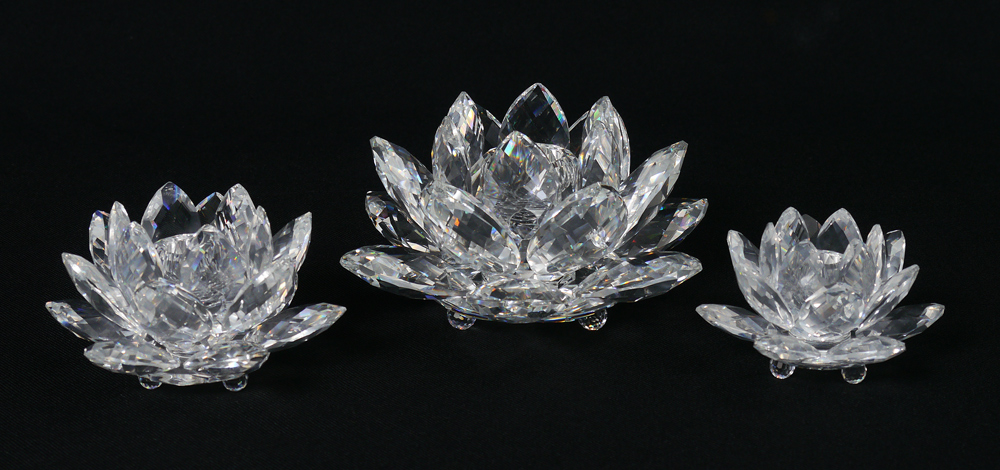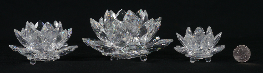 SWAROVSKI CRYSTAL 3 PIECE LOT: Set of three Max Schreck designed, Water Lily candle holders. LARGE 7600 125 000, issued 1985, discontinued. With box and card of Swarovski Wax Tabs, no certificate. MEDIUM 7600 123 000, issued 1982 retired 2011. With box, wax tabs, and certificate. SMALL 7600 124 000, issued 1985. With box and certificate. Sold as a lot.