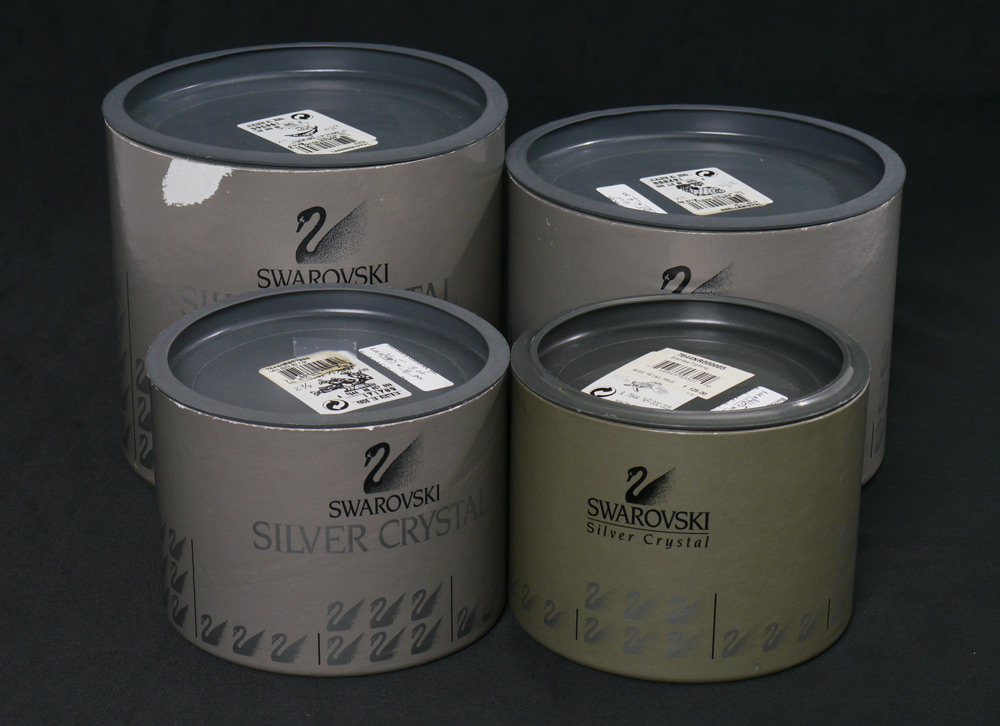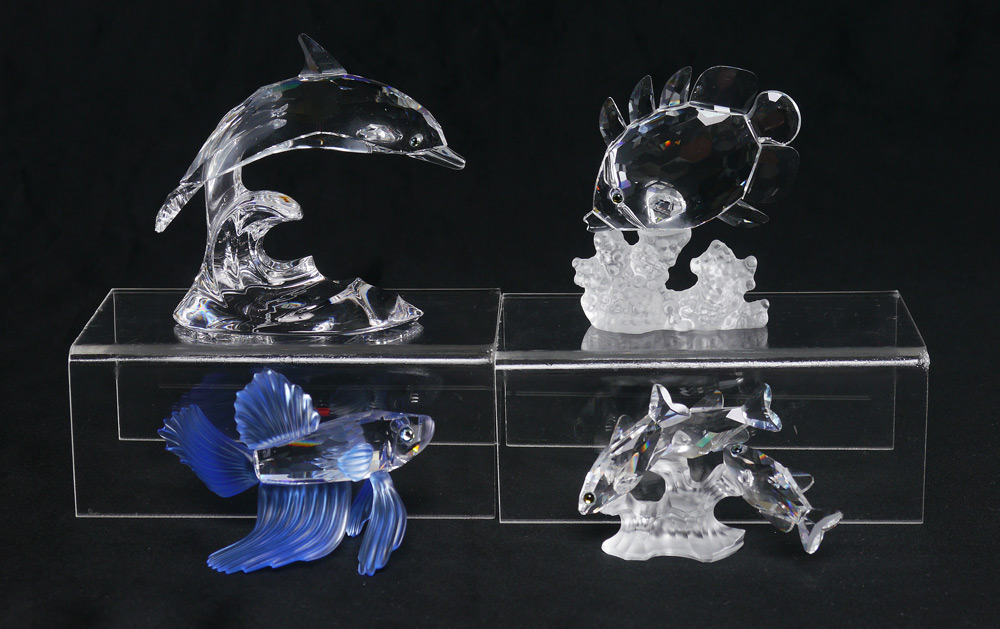 SWAROVSKI CRYSTAL FIGURINES, 4 PIECE LOT: 1) DOLPHIN 764 000 001, Michael Stamey designer, issued 1995. With box and large red book certificate. 2) BUTTERFLY FISH 7644 077 000, Michael Stamey designer, issued 1991 retired Dec 1998. With box and certificate. 3) THREE SOUTH SEA FISH 7644 057 000, Michael Stamey designer, issued 1993 retired Dec 1998. With box and certificate. 4) Blue SIAMESE FIGHTING FISH 7644 000 005, 7644 000 005, Heinz Tabertshofer designer, issued 1999 retired 2005. With box and certificate. Sold as a lot.