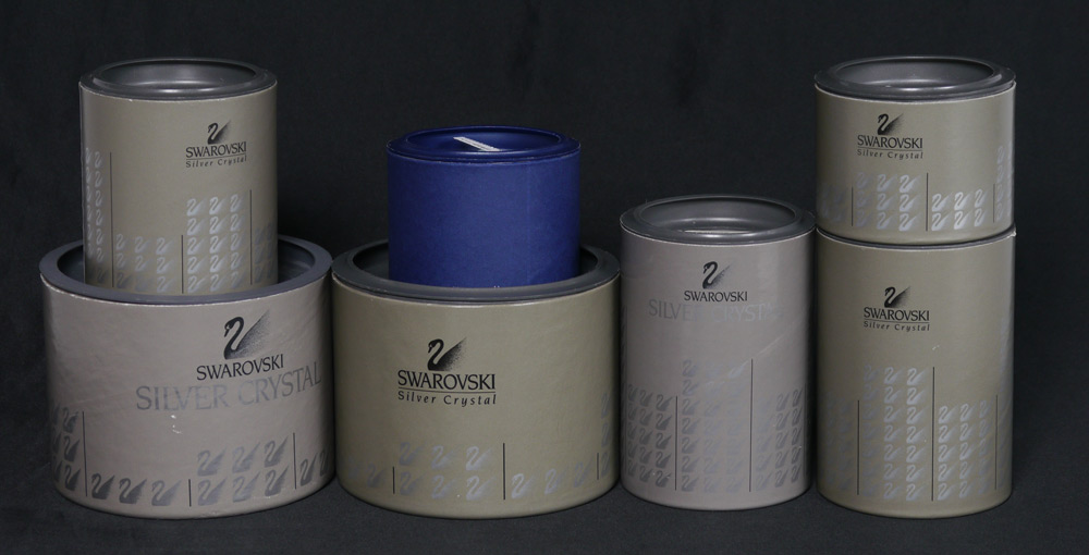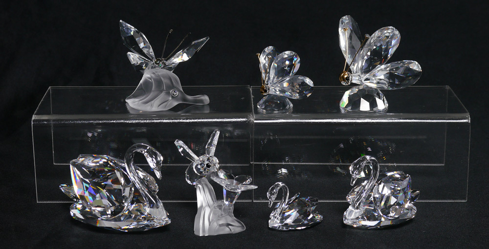 SWAROVSKI CRYSTAL BUG & BIRD LOT: 7 piece to include, 1) BUMBLEBEE 7615 000 002, Claudia Schneiderbauer designer, issued 1992 retired Dec 1997. With box and certificate. 2) Large BUTTERFLY 7639 055 000, with gold mask and antenna with crystal tips, Team design, issued 1982 retired 2006. With box and certificate. 3) Mini BUTTERFLY 7667 035 000, with gold mask and crystal tips to antenna, Team design, issued 1986 retired 2007. With box and small red book certificate. 4) BUTTERFLY on a LEAF 7615 000 003, Claudia Schneiderbauer designer, issued 1994. With box and certificate. Reattached antenna section. 5) Large SWAN 7633 063 000, Var. 2, Max Schreck designer, issued 1977. With box and certificate. 6) Medium SWAN 7633 050 000, Var. 1, Max Schreck designer, issued 1977. With box and certificate. 7) Small SWAN 7633 038 000, Max Schreck designer, issued 1995 retired 2004. Sold as a lot.