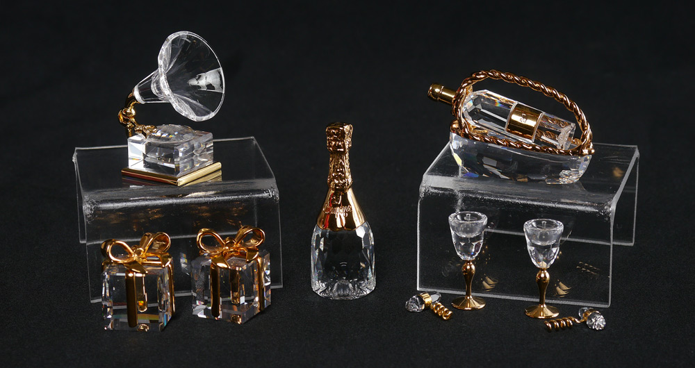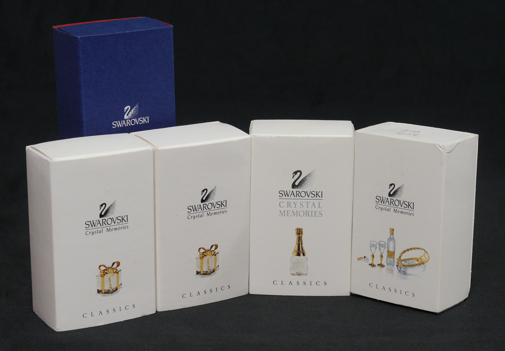 SWAROVSKI CRYSTAL MEMORIES CLASSICS, 5 piece: 1) GRAMOPHONE 9460 000 056, Edith Mair designer, issued 1995 retired 2004. With box, sleeve and certificate book. 2-3) PRESENT 9460 000 066, gold plate ribbon, Edith Mair designer, issued 1995 retired 2005. Each with box and sleeve. Neither with certificate. 4) SPARKLING WINE 9460 000 077, Team design, issued 1997 retired 2004. Box and sleeve, no certificate. 5) WINE SET usual 5 pieces plus extra cork screw 9460 000 096, Team design, issued 1999 retired 2004. Box and sleeve, no certificate. Sold as a lot.