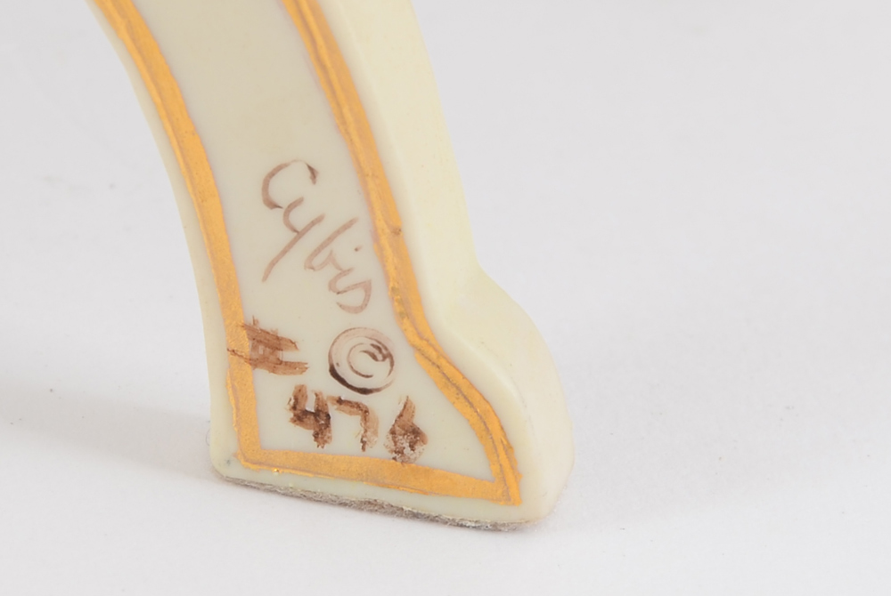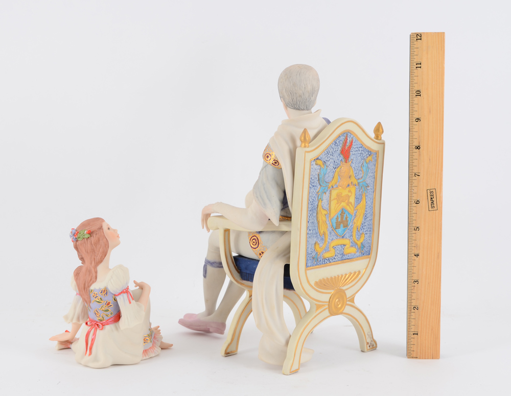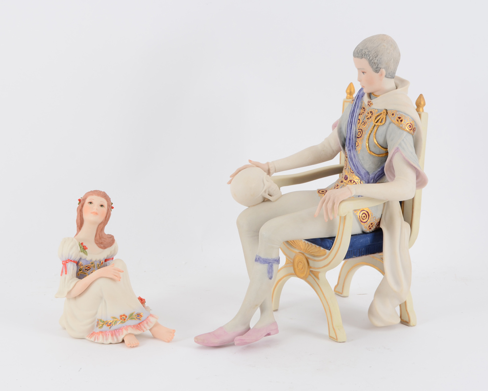 2 PIECE CYBIS PORCELAIN HAMLET & SEATED WOMAN: 2 pieces total to include 1) Figure of Hamlet seated on a throne holding a skull, signed Cybis, #476. 11'' h. x 6'' x 8 1/2''. 2) Seated young woman, signed Cybis, 83. 5 1/2'' h. x 4 1/2''.