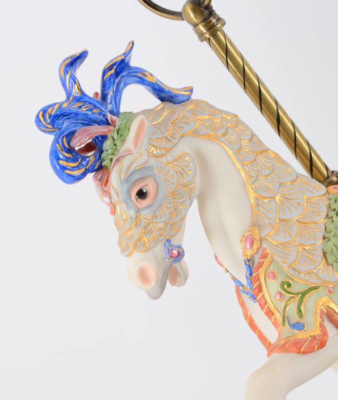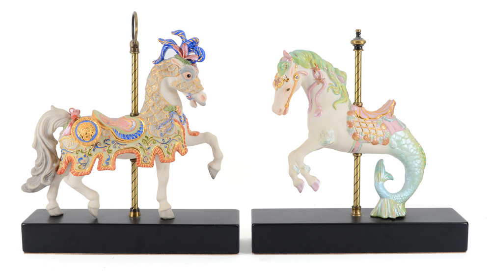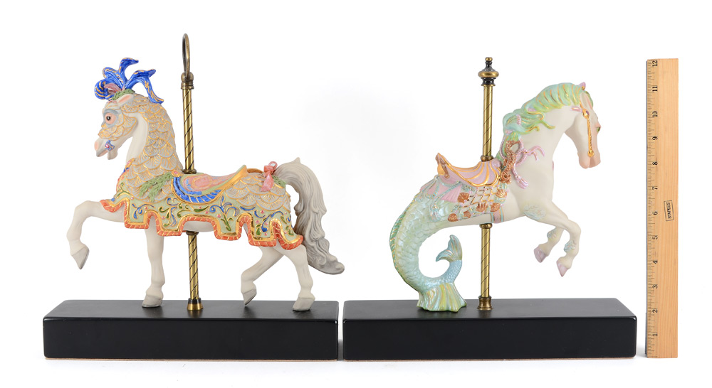 PAIR CYBIS PORCELAIN CAROUSEL HORSES: 2 pieces total to include 1) Armored horse, signed Cybis, 332, overall 13 1/4'' h. x 12'' x 3 1/2''. 2) Merhorse, signed Cybis, 32, 12 1/2'' h. x 12'' x 3 1/2''