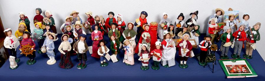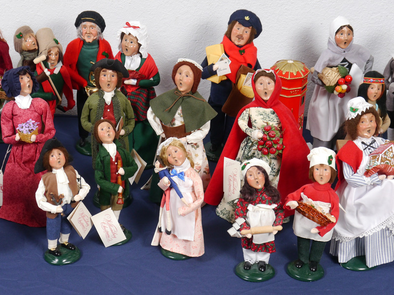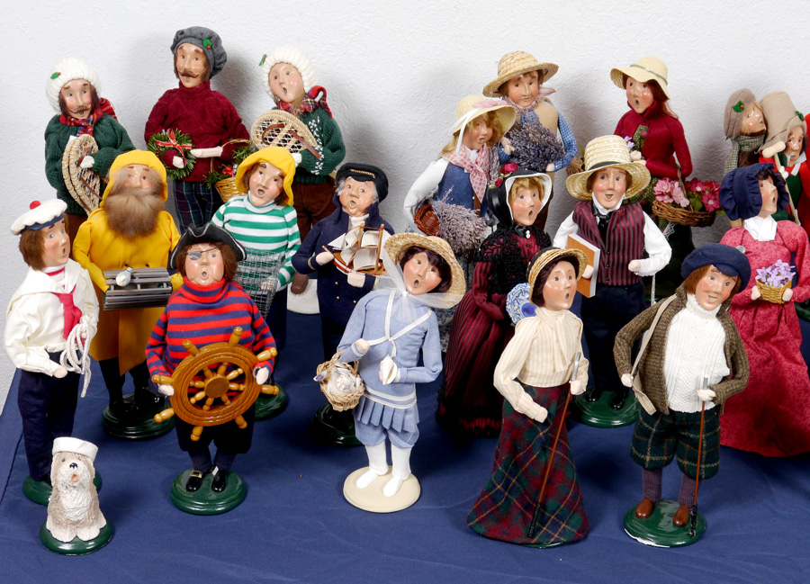 ORIGINAL BYERS CHOICE ''THE CAROLERS'': Approx. 45 pieces to include characters representing Old Sturbridge Village, Williamsburg Christmas, First Thanksgiving, Tiny Tim and the Cratchets, Christmas Waits, golfers, croquet players, a group of Seafarers, and a post man with post box. Hand crafted in Chalfont PA USA.