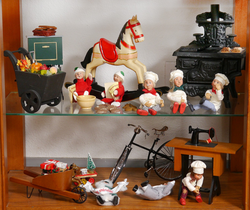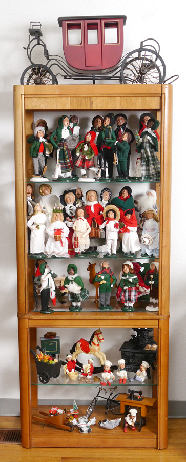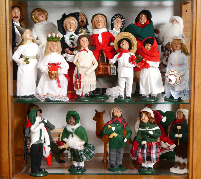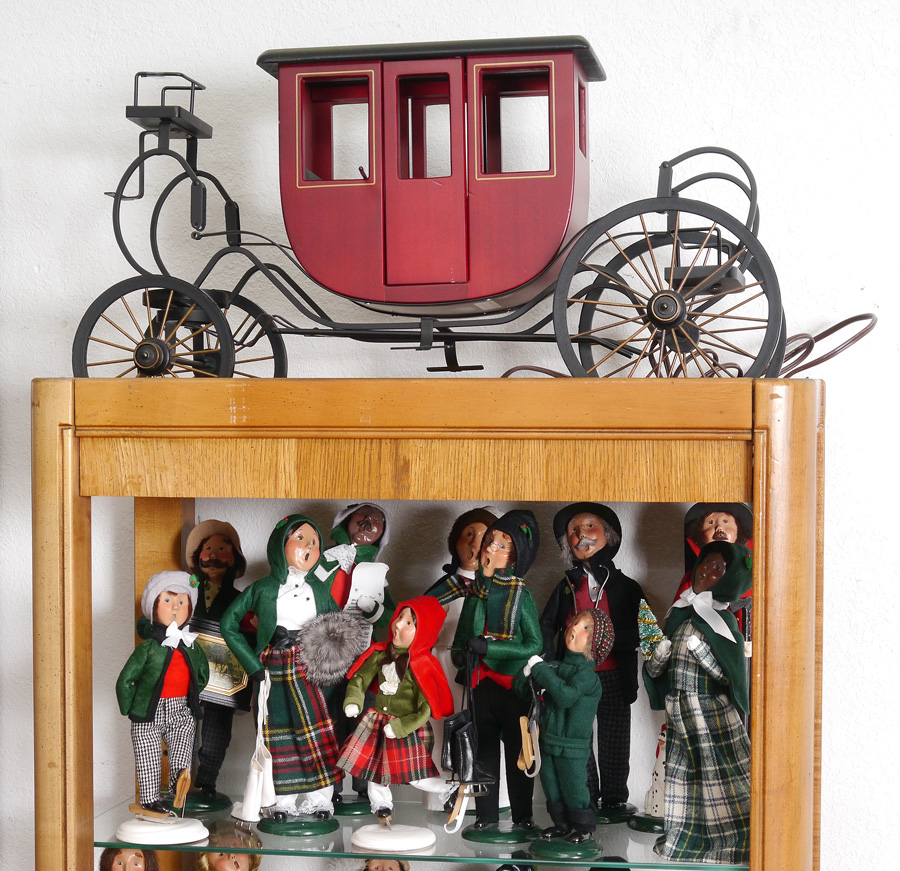 ORIGINAL BYERS CHOICE ''THE CAROLERS'': Approx. 32 pieces to include Santa, Mrs. Claus, village ice skaters, children in International dress, Organ grinder. Hand crafted in Chalfont PA USA. Sold with the carriage, iron stove, and accessories that may or may not be Byers.