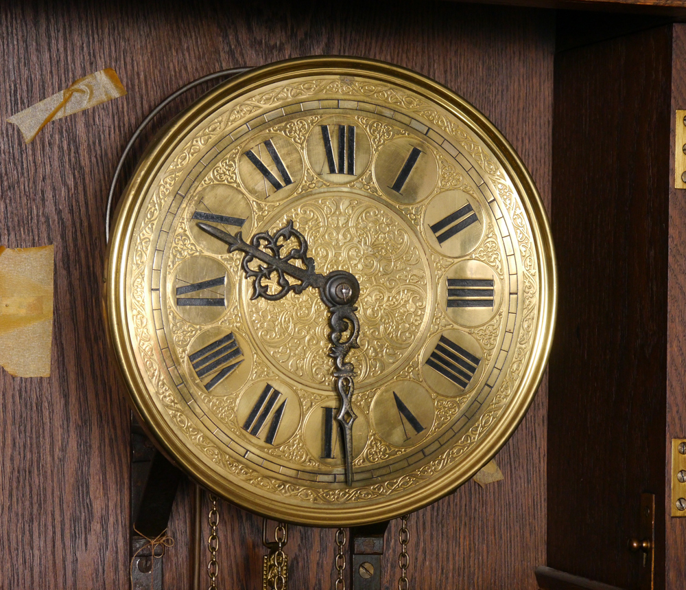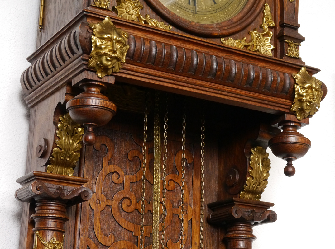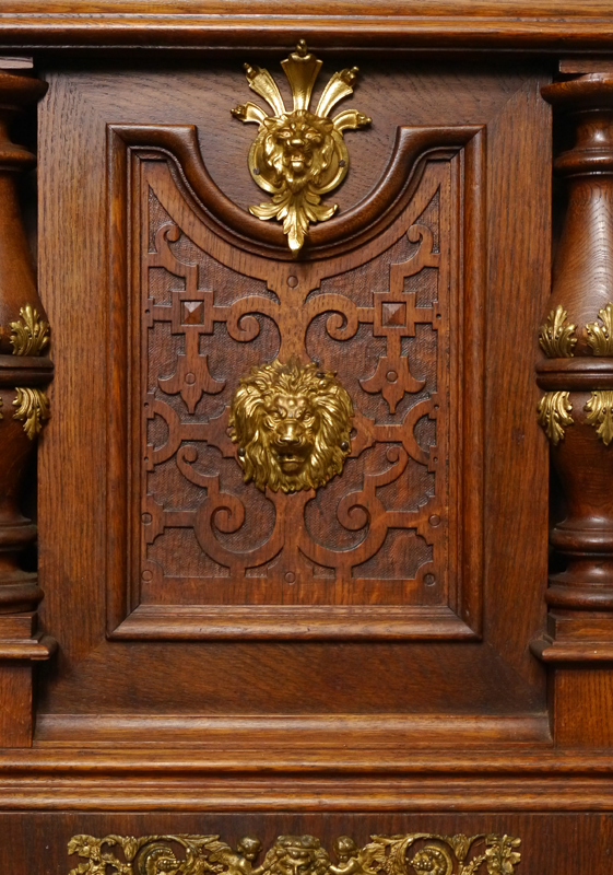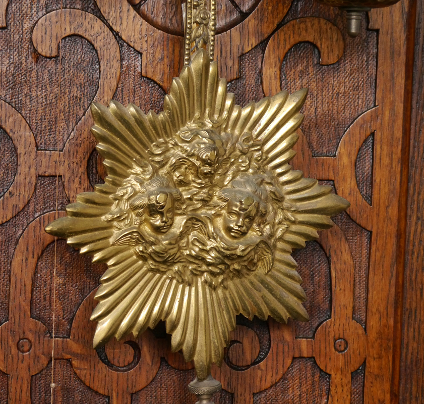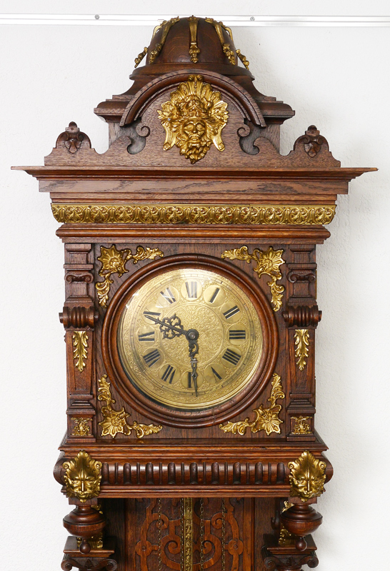 GERMAN CARVED & ORMOLU MOUNTED TALL CASE CLOCK: Late 19th to early 20th century, profusely carved oak case with applied ormolu decoration to include masquerons, trim, foliate and floral decoration. Brass dial with Roman numerals, L. Furtwangler & Sohne time and strike movement, double weight, pierced and embossed pendulum. 90 1/4'' h. x 22 3/4'' x 13''.