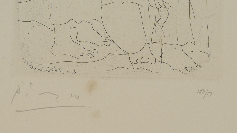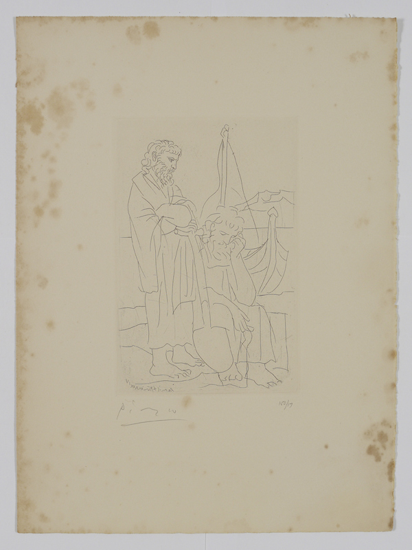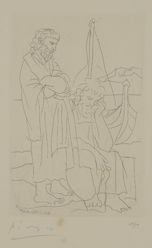 PICASSO, Pablo, (Spanish, 1881-1973): ''Deux Vieillards et Voilier'', from Lysistrata, Etching, full size with margins 15'' x 11 1/8'', impression size approximately 8 1/2'' x 6'', pencil signed lower left, numbered 17/150 lower right, unframed, on Arches watermarked paper. Printed for the Print Club, New York, in 1934.