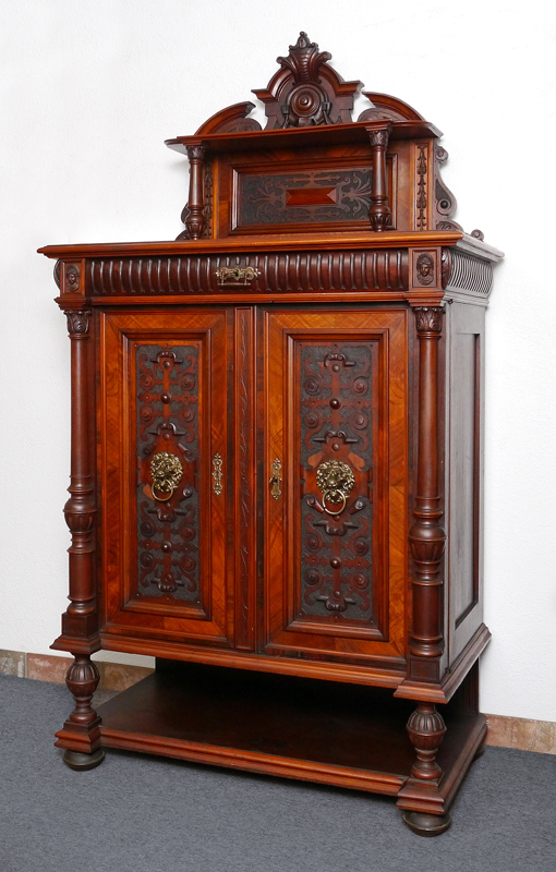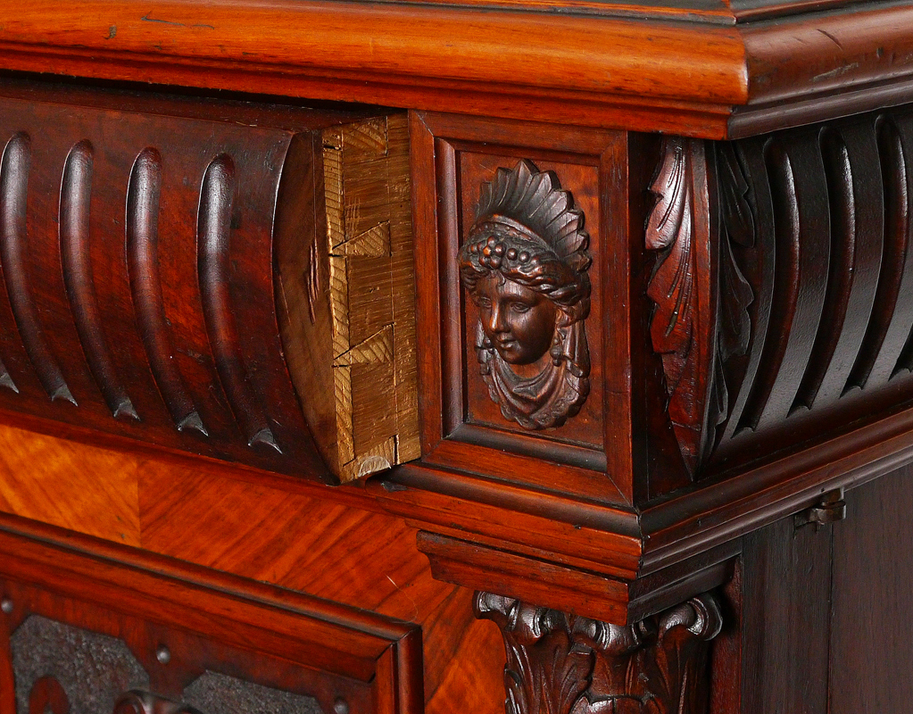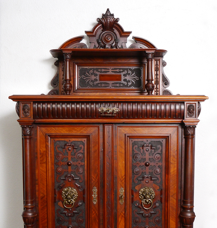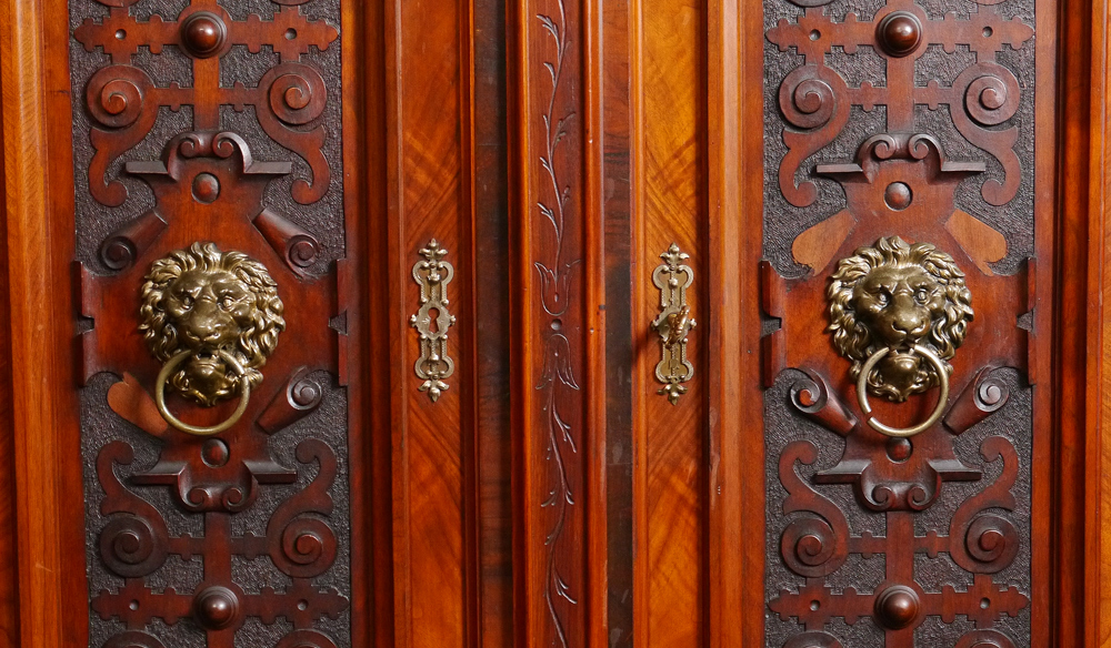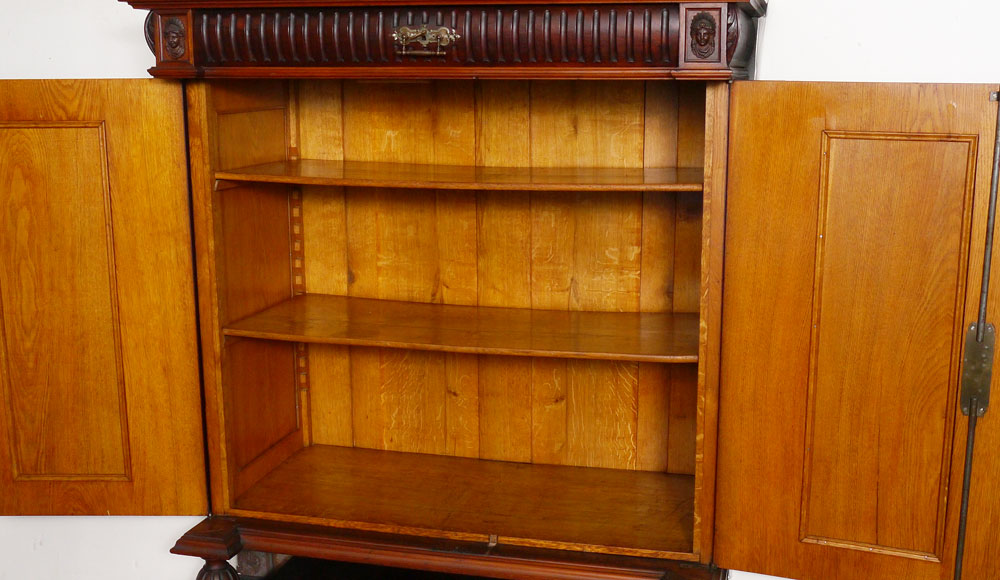 FINE 19TH CENTURY CARVED GERMAN SIDEBOARD: Top with carved decoration over single open shelf over decorated backsplash. Body with single drawer over 2 doors with carved wood panels, applied cast metal lion masqueron pulls. Base with open storage on bun feet. Overall approx. 84'' h. x 43 1/4'' x 23''.