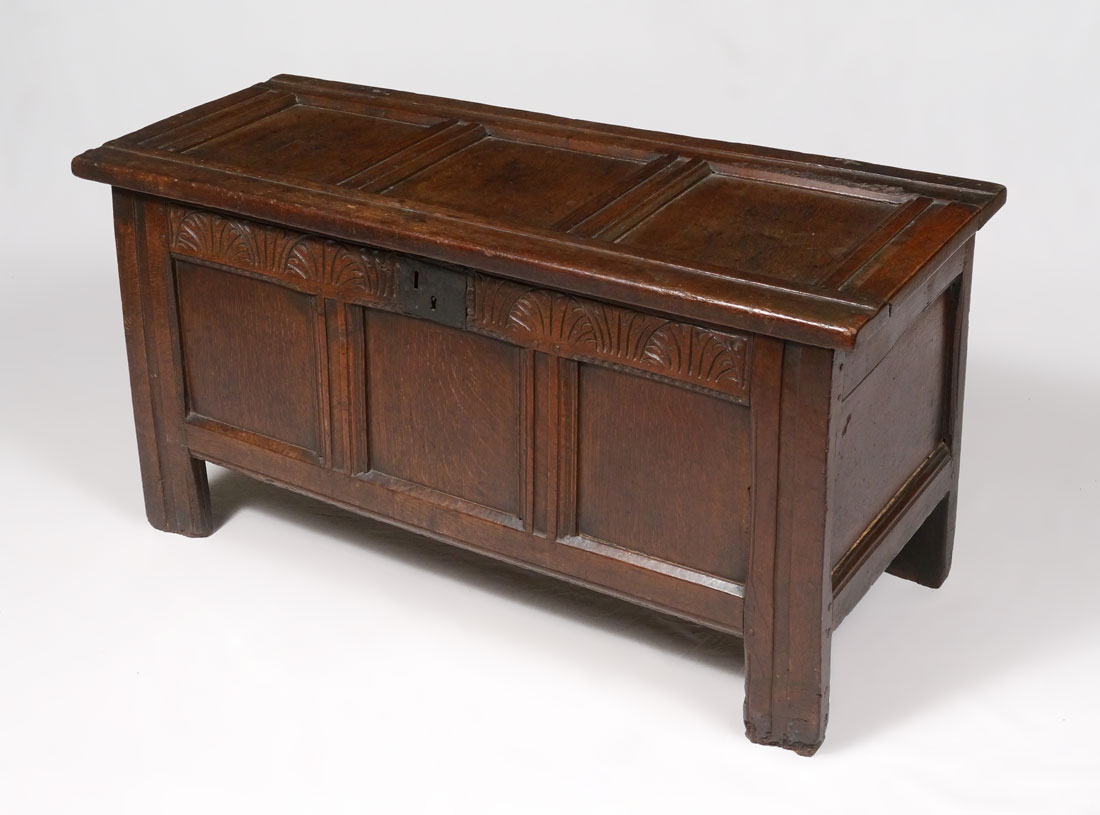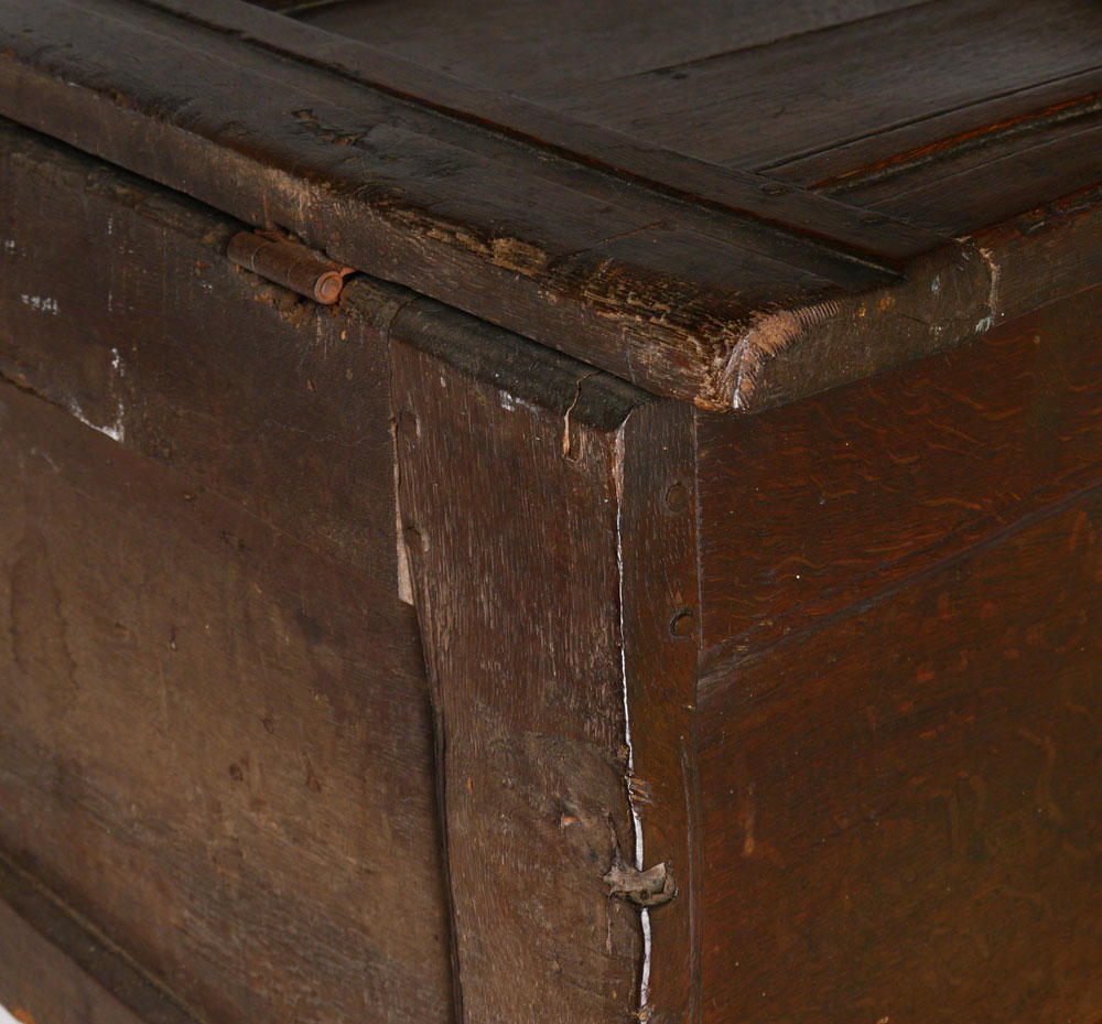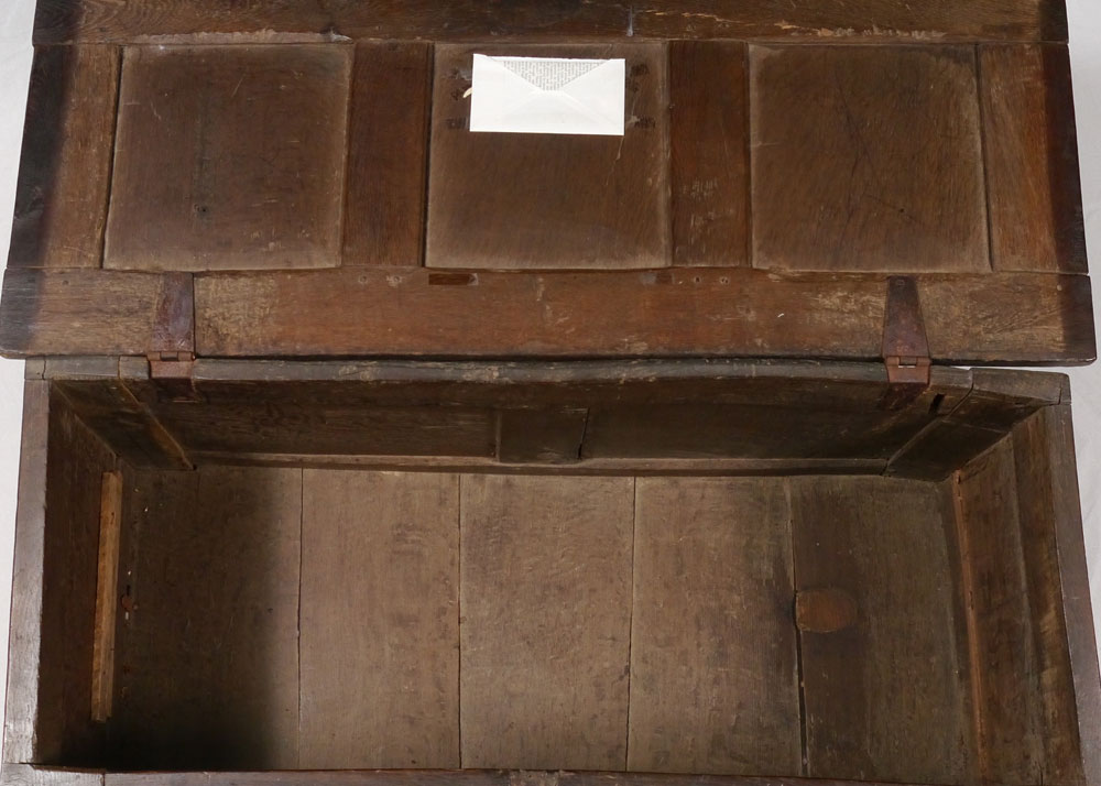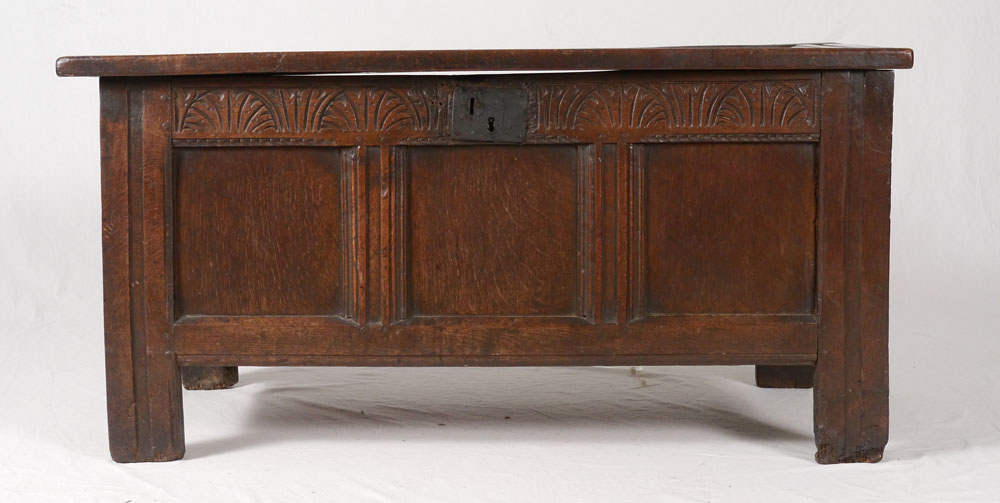 18TH CENTURY EUROPEAN OAK BLANKET CHEST: Hand hewed chamfered paneled tops and sides, front with additional carved decoration. Overall measures 22'' h. x 44 1/4'' x 18''.
