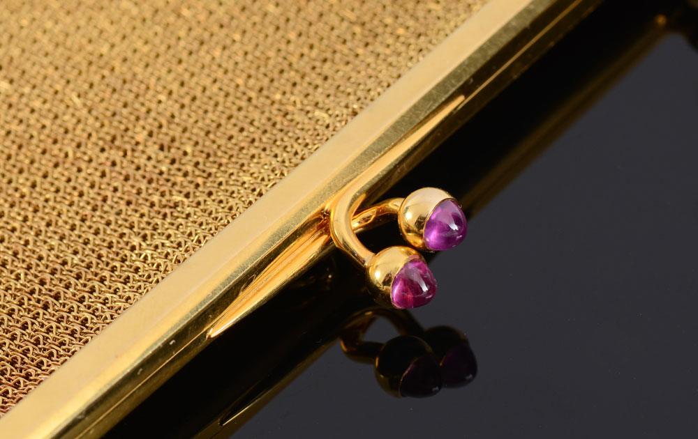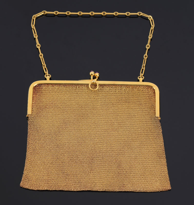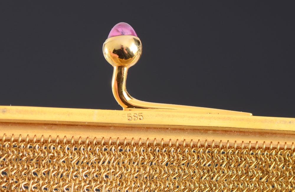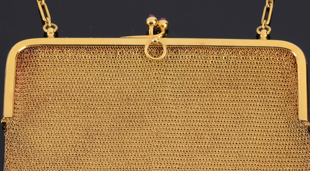 14K GOLD MESH PURSE: Clasp set with cabochon rubies, purse measures approx. 5.5'' x 5.5'' plus 6'' link chain handle. Marked on frame 585, weight 256 grams.