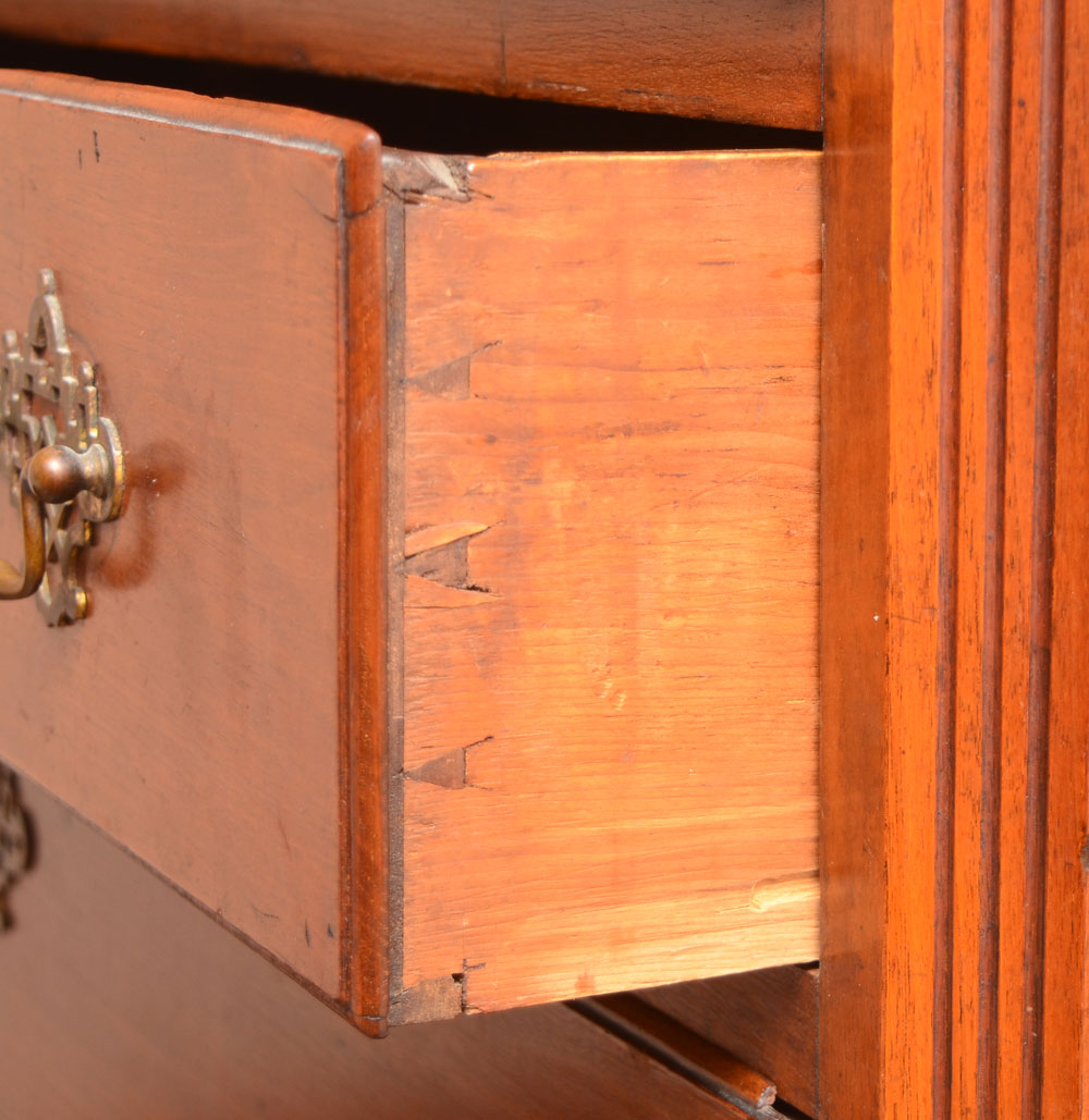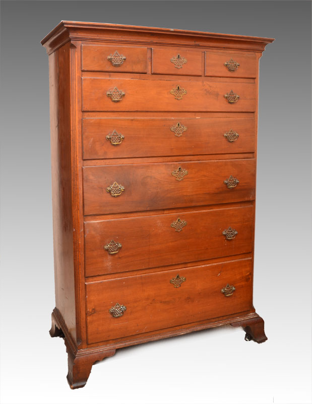 19TH CENTURY CHERRY TALL CHEST OF DRAWERS: Mid to late 19th century, 3 drawers over 5 graduating full length drawers. Fluted styles, replaced heavy bracket feet. Overall measures 65 3/4'' h. x 43 3/4'' x 21 3/4''.