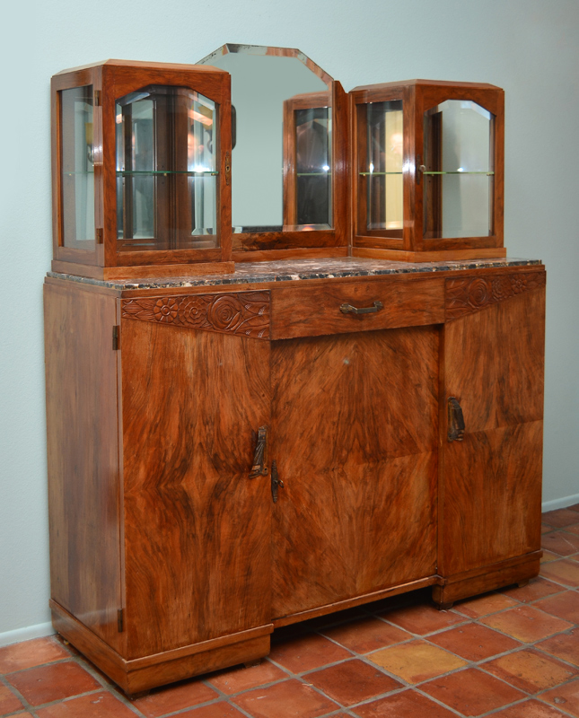 FRENCH ART DECO WALNUT CARVED MARBLE TOP SIDE CABINET: Back with central mirror surmounted either side by glass shadowbox display boxes with single shelf and mirrored backs. Marble top over central drawer over door. 2 side doors with carved decoration at top. Measures 69 3/8'' x 60'' x 21''.