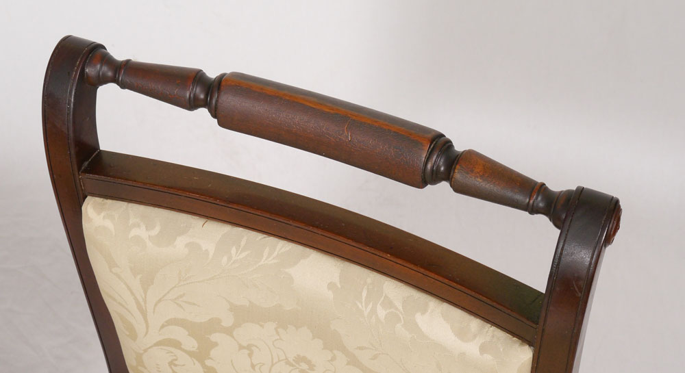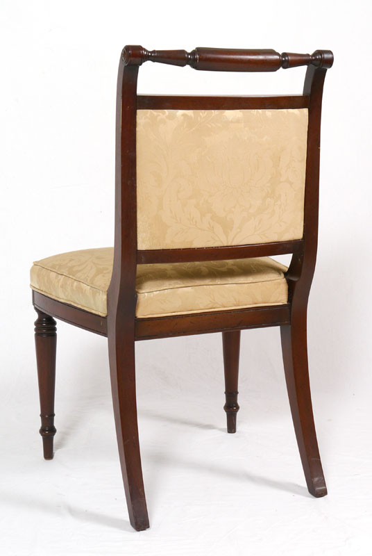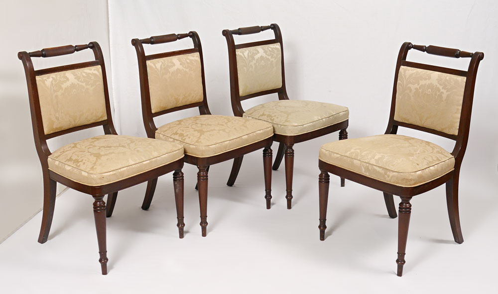 SET OF 4 SIDE CHAIRS: Shaped back, turned top rail and front legs, ivory floral pattern upholstery. 36 1/2'' h. x 21 1/2'' x 23 1/2''.