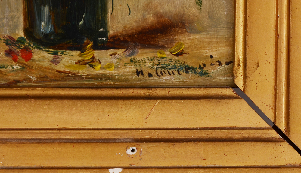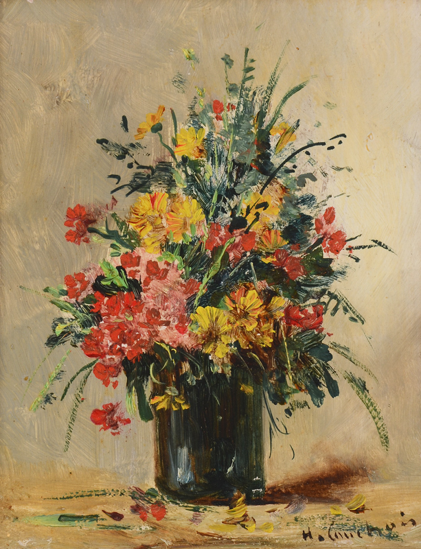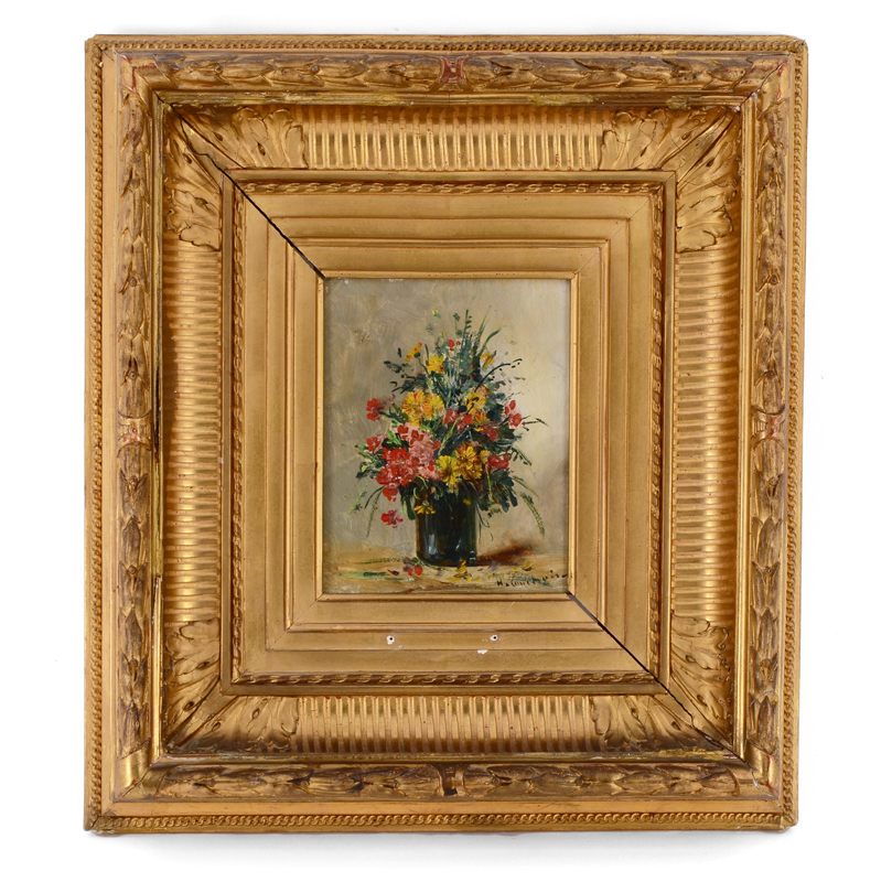 CAUCHOIS, Eugene Henri, (French, 1850-1911): Floral Bouquet in a Vase, Oil/Wood Panel, 6'' x 4 5/8'', signed lower right, carved and gilded frame 14'' x 13''.