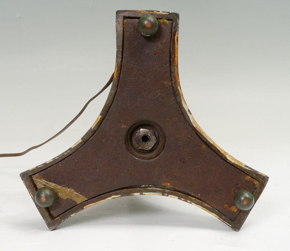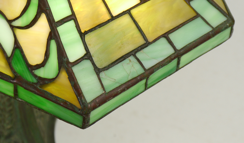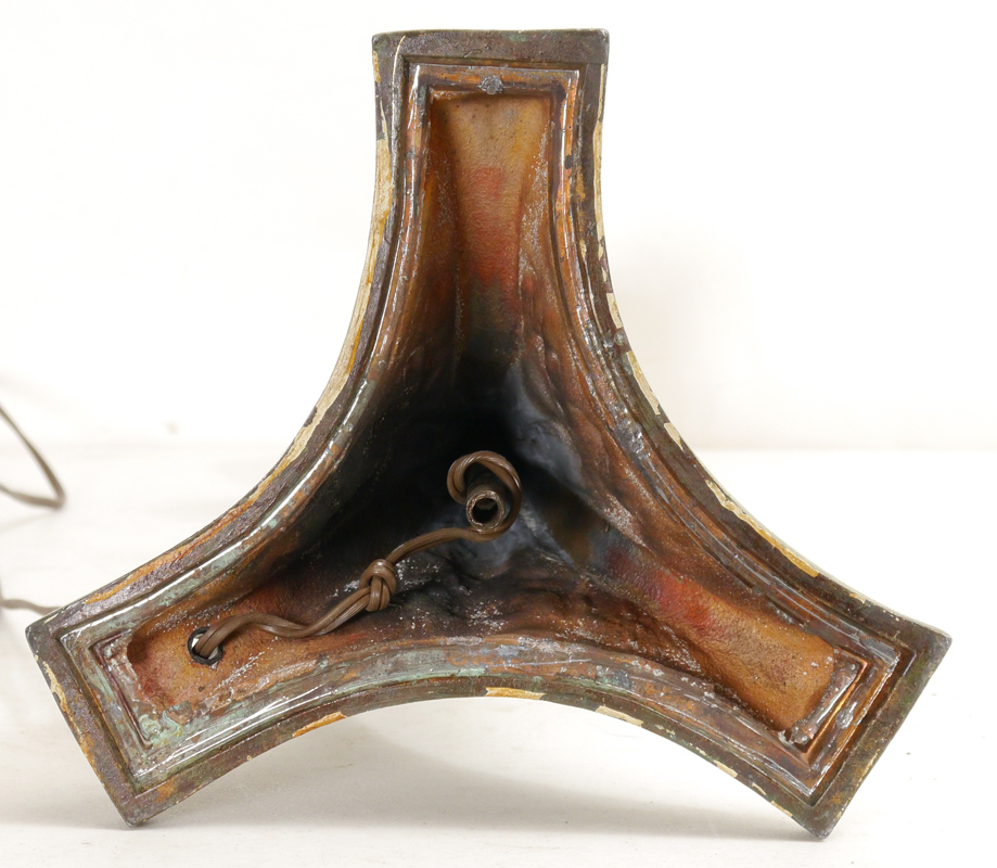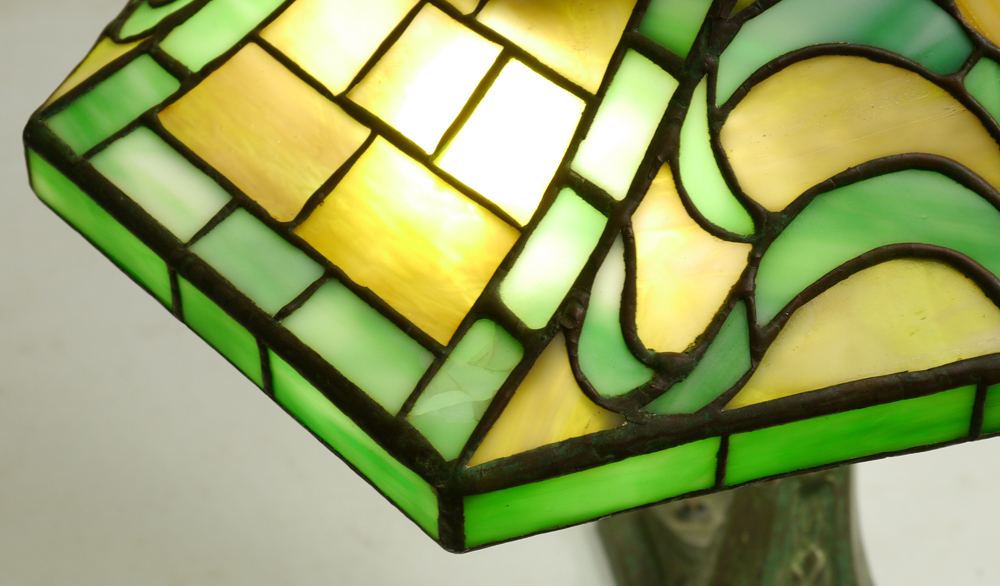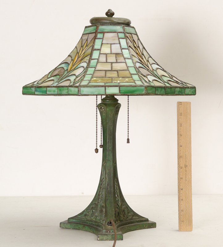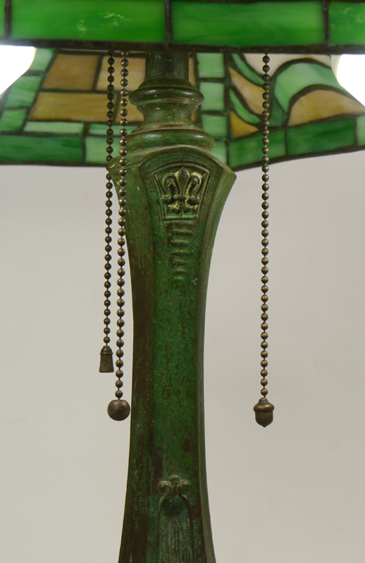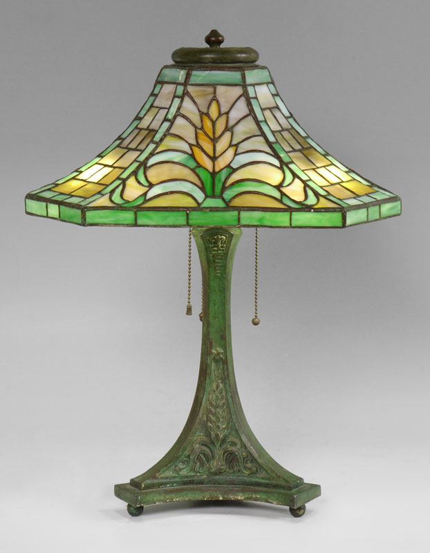DUFFNER & KIMBERLY 6 SIDED LEADED GLASS TABLE LAMP: ''Flaming Sword'', 6 sided leaded stained glass lamp, on page 216 of Paul Crist's book, ''Mosaic Shades II''. Shade measures 6 1/2'' x 14 1/4''. Heavy cast bronze base with matching pattern, 3 socket fixture, 21'' h. x 9''.