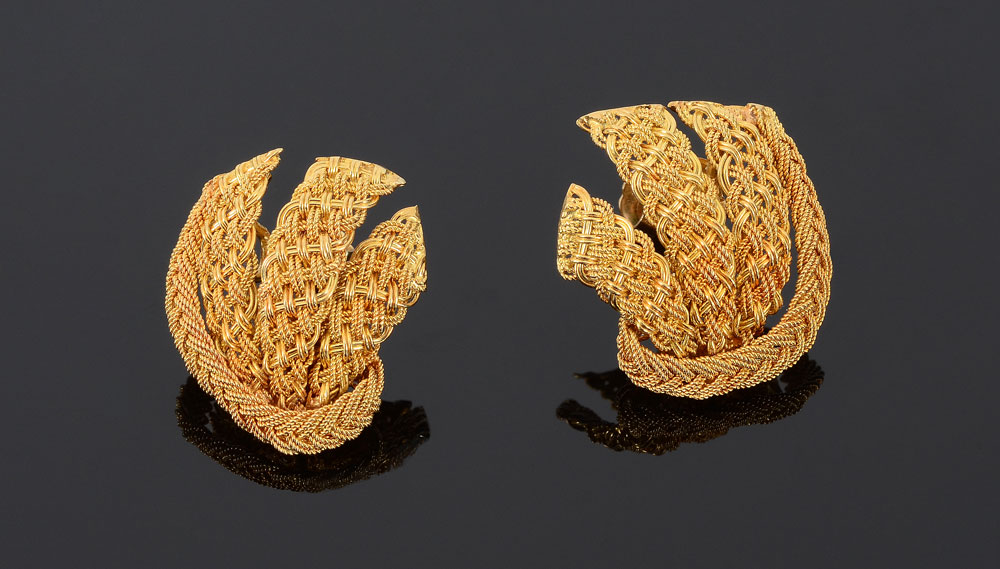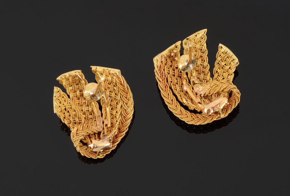 18K WOVEN GOLD EARRINGS: Intricately woven 18K yellow gold earrings. Post and nut closure. Diameter: 7/8''. Weight: 9.9 grams.