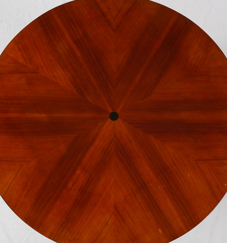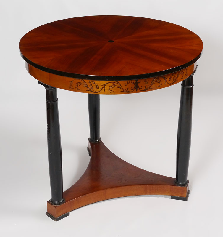 BIEDERMEIER STYLE ROUND TABLE: Mahogany veneer top, apron decorated with putti and foliate scroll motifs. Ebonized pillar supports on tri-cornered base. Overall 30'' h. x 32 1/4''.