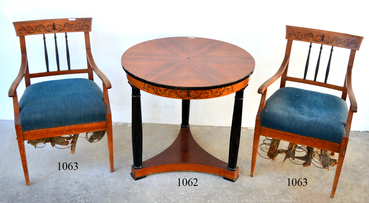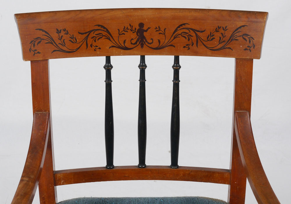 PAIR OF BIEDERMEIER STYLE ARM CHAIRS: Top rail decorated with putti and foliate scroll motif, ebonized turned back splats, shaped arms and supports, green tweed upholstery. Overall measure 35'' h. x 22'' x 25''.