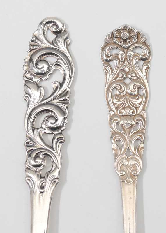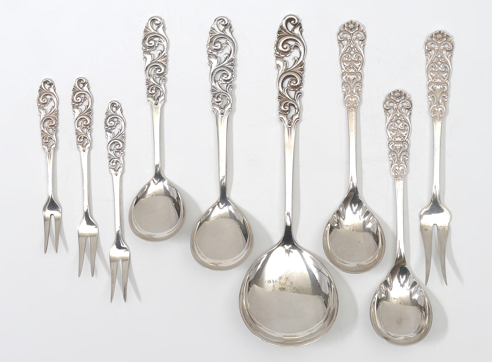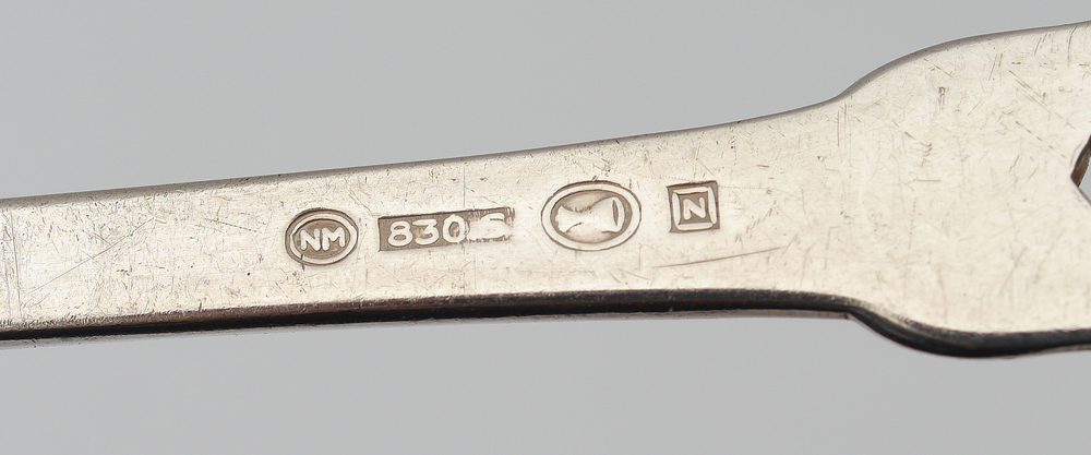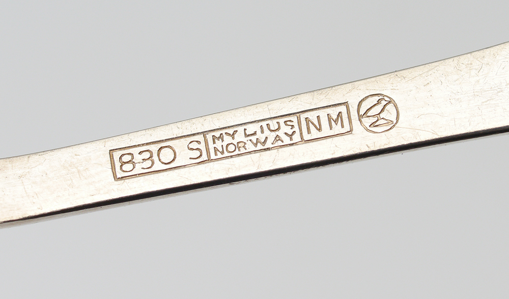 BRODRENE MYLIUS NORWEGIAN SILVER FLATWARE: 9 piece total hallmarked with Brodrene Mylius cypher, 830S, and Norwegian marks. Pierced handles, to include tablespoon (7 1/2''), 4 assorted spoons (largest 5 3/4''), 4 assorted cocktail / lemon forks (largest 5 3/4''). Approx. 5.4 troy oz.