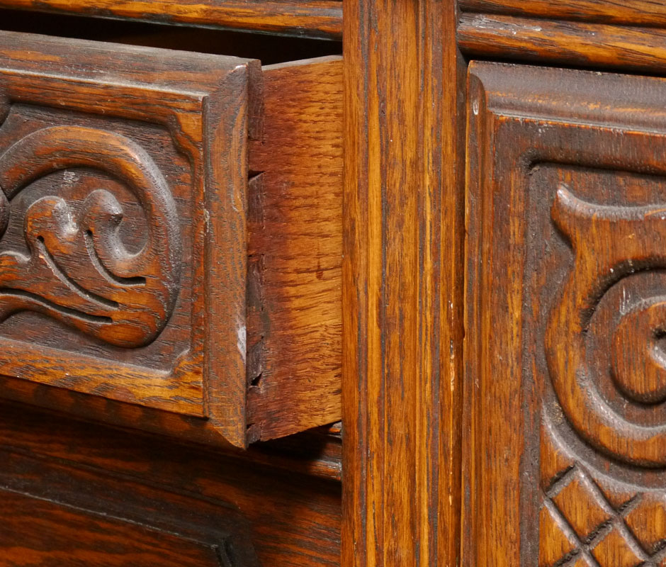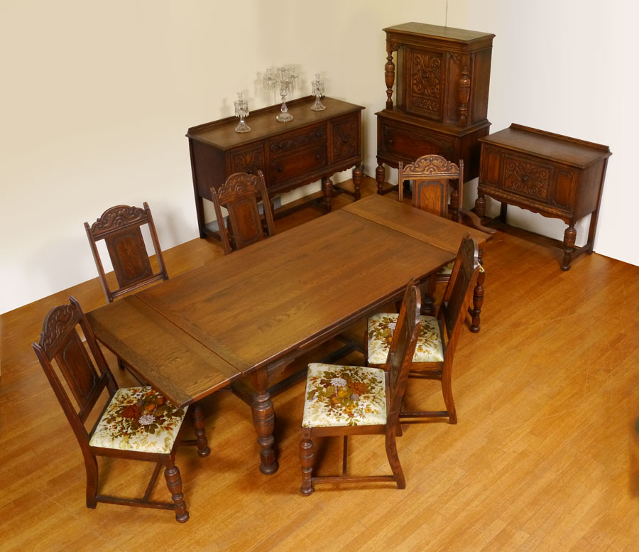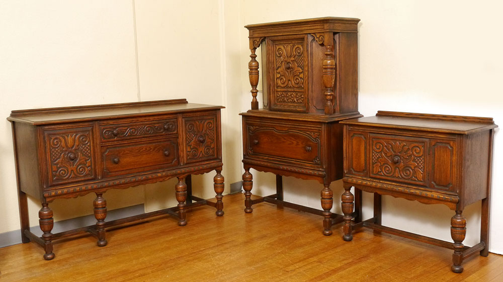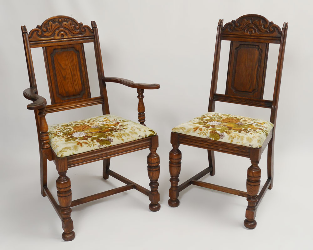 10 PIECE CARVED OAK DINING SET: 10 pieces total, early to mid 20th century, to include draw leaf TABLE with turned legs, 30'' h. x 60'' x 38''; 6 chairs (1 arm 40 1/2'' h. x 28'' x 22 1/2'', 5 side); HUTCH with single carved door over single drawer, 61 1/2'' h. x 37'' x 17''; SERVER with single carved door, 35'' h. x 36'' x 16 1/4''; SIDEBOARD with 2 carved central drawers and 2 carved doors, 37 1/2'' h. x 60'' x 20''.