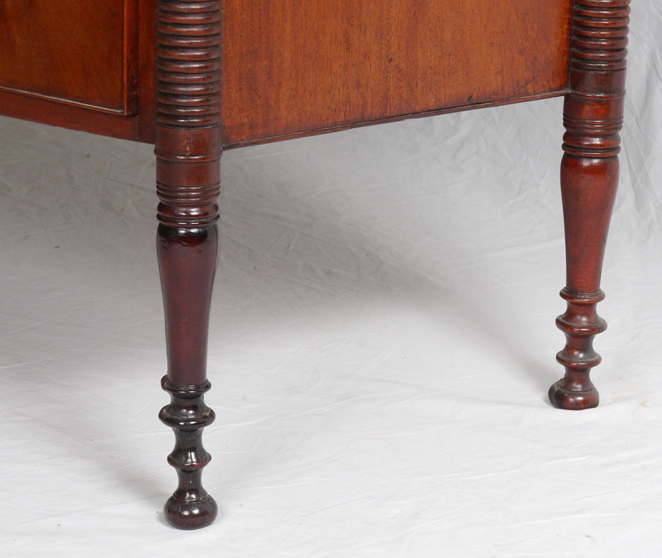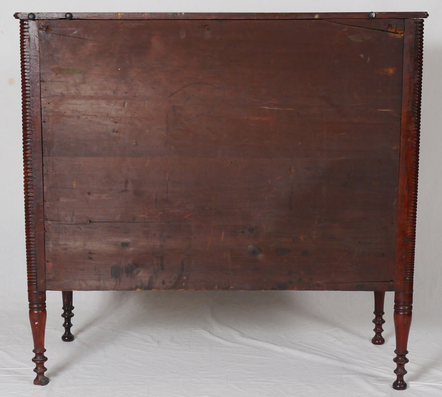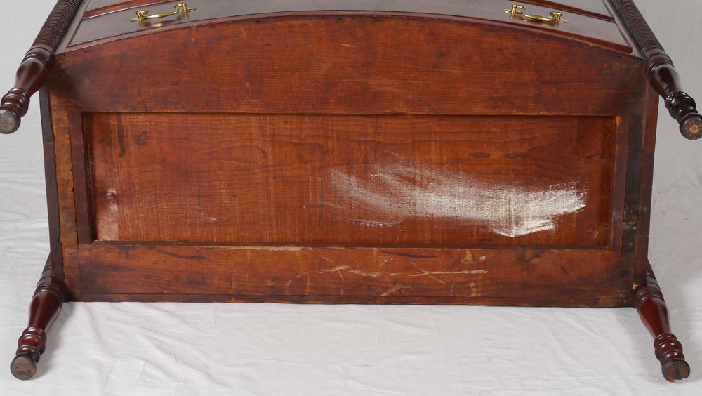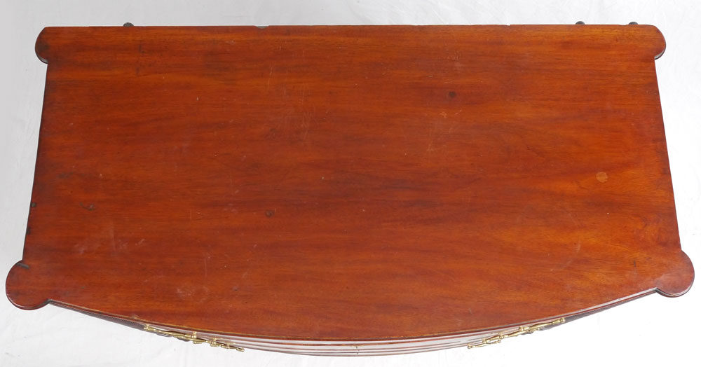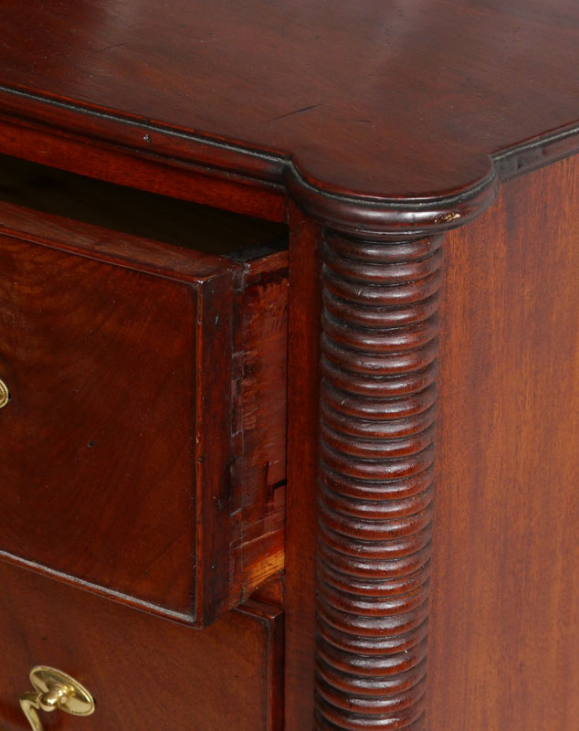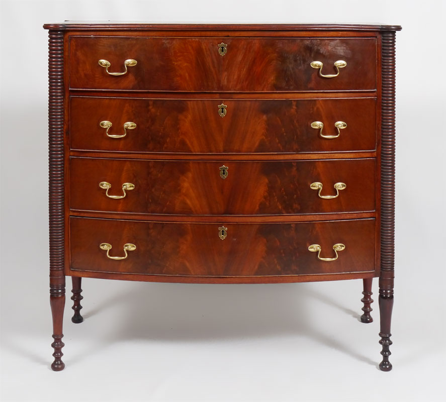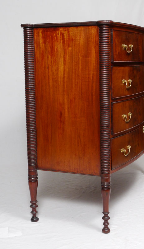 SHERATON BOW FRONT MAHOGANY CHEST: Bowed top with cookie corners, turned front and rear stiles and feet. 4 drawers with chamfered bottoms, brass pulls. Drew Murphy Estate. Overall measures 42'' h. x 43'' x 21 1/2''.