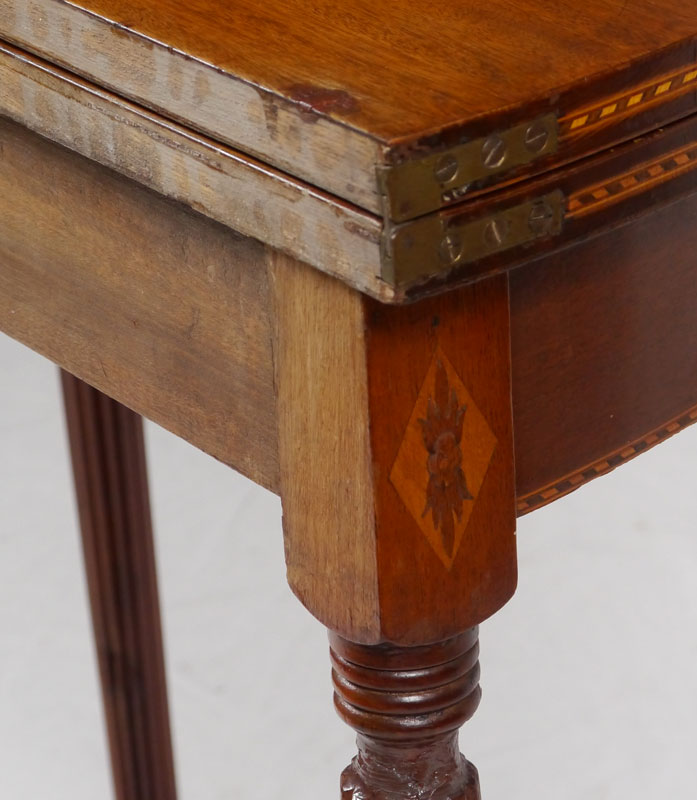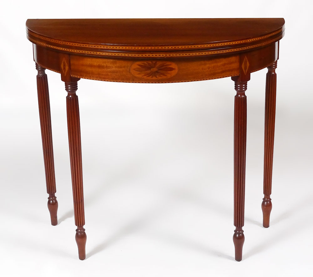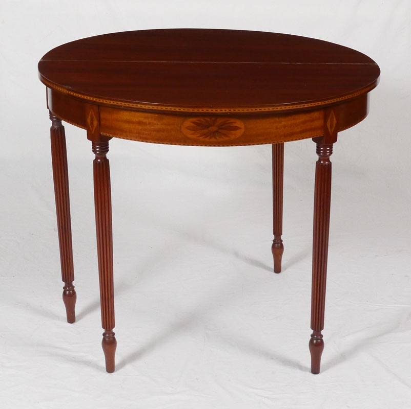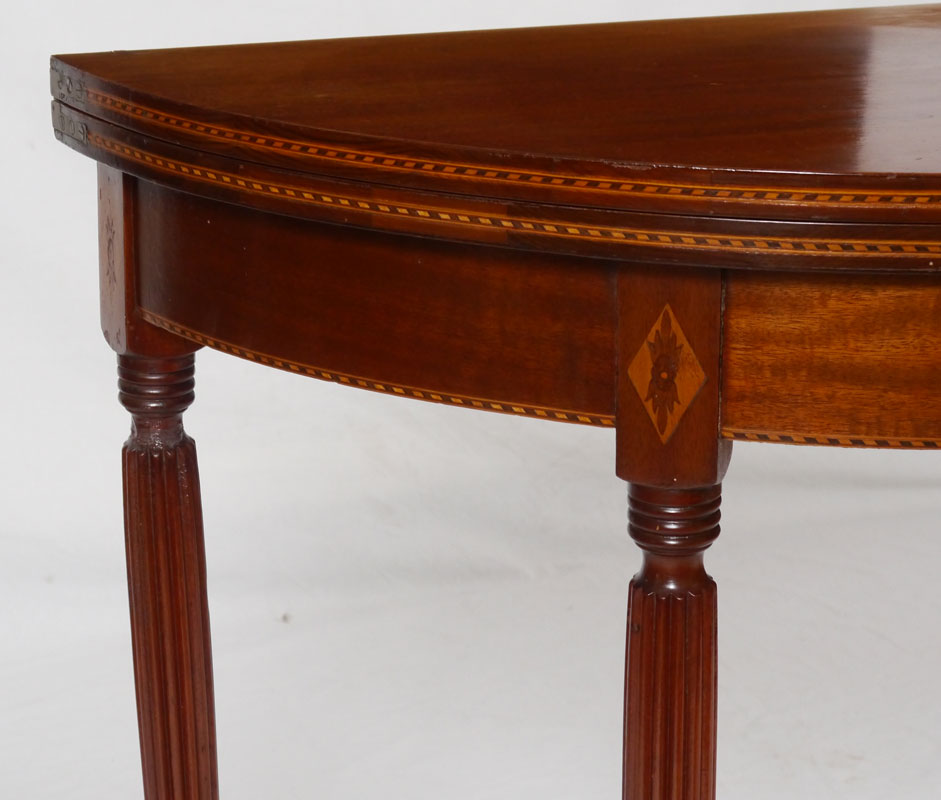 SHERATON INLAID MAHOGANY DEMI LUNE GAME TABLE: Demi lune top with gadroon inlaid edges, skirt with floral marquetry at joints to reeded legs. Overall closed 31'' h. x 36'' x 18''.