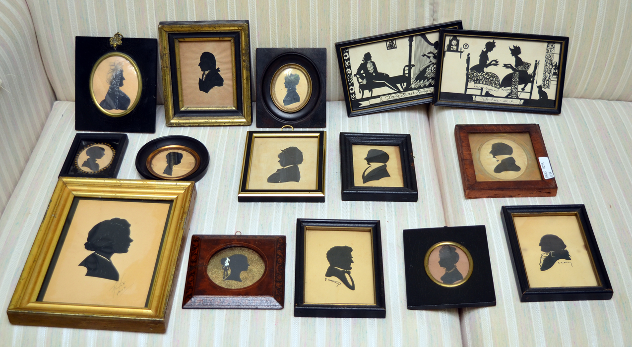 COLLECTION OF SILHOUETTES OF VARIOUS AGES: 15 piece assembled collection of silhouettes with the largest sight size being 7'' x 5 3/8'', framed 9 1/4'' x 7 1/4''.