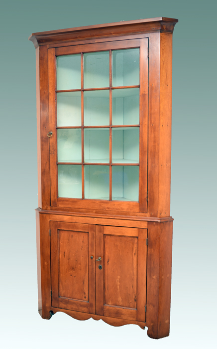 19TH CENTURY CHERRY CORNER CABINET: Top with 12 light glass door, 3 internal shelves, painted interior. 2 blind door base with single shelf, painted interior. Overall measures 85 3/4'' h. x 44'' x 23''.